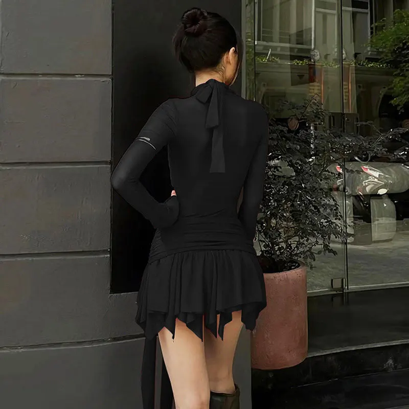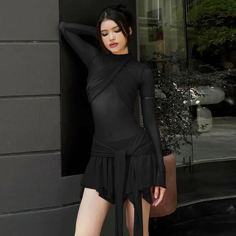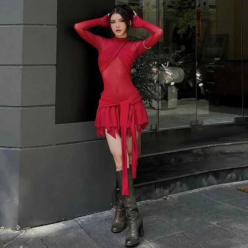 Elegant Mesh Pleated Sheer A-Line Mini Dress Party Club Outfits for Women Long Sleeve Ruched Sexy Bodycon Dresses