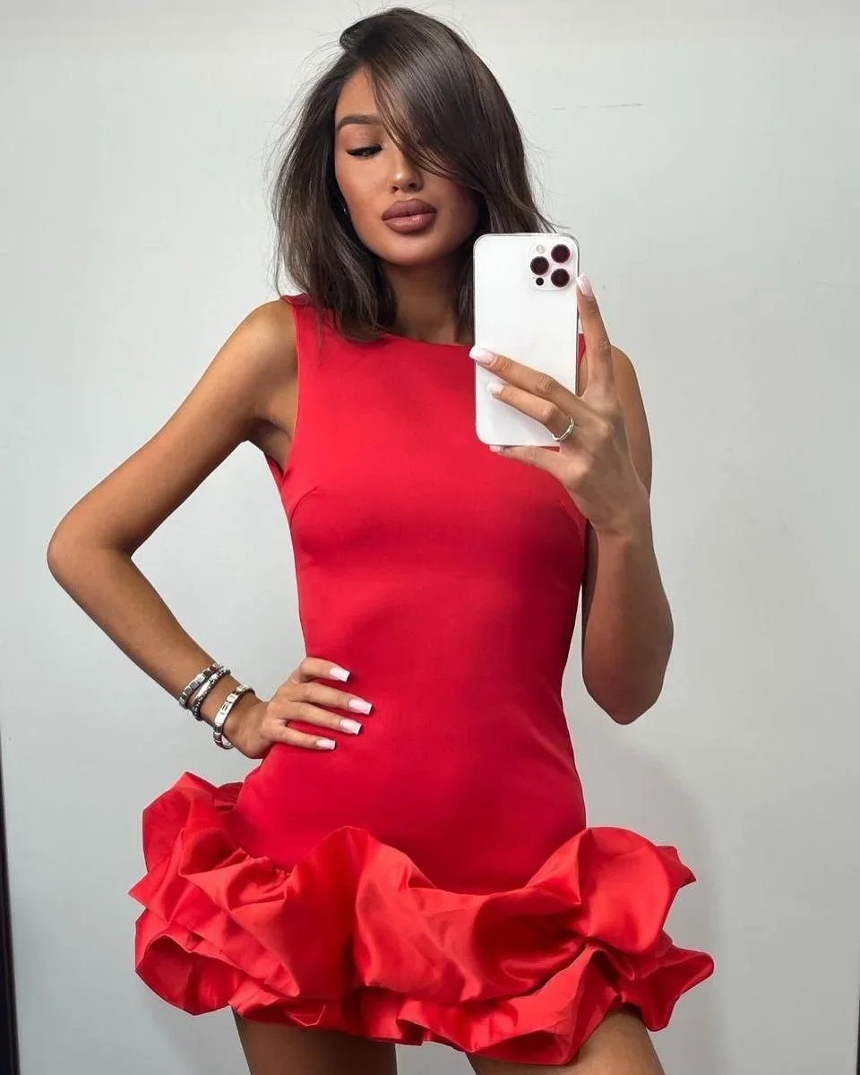 Sexy Ruffled Hem Slim Mini Vest Dress for Women O-neck Sleeveless Summer Elegant Lady Party Club Evening Dress