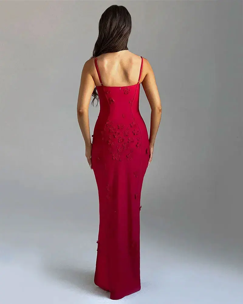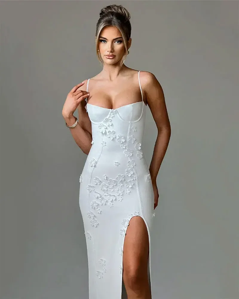 3D Flower Sexy Maxi Dress for Women Fashion Off Shoulder Backless Thigh High Split Bodycon Club Party Evening Long Dress
