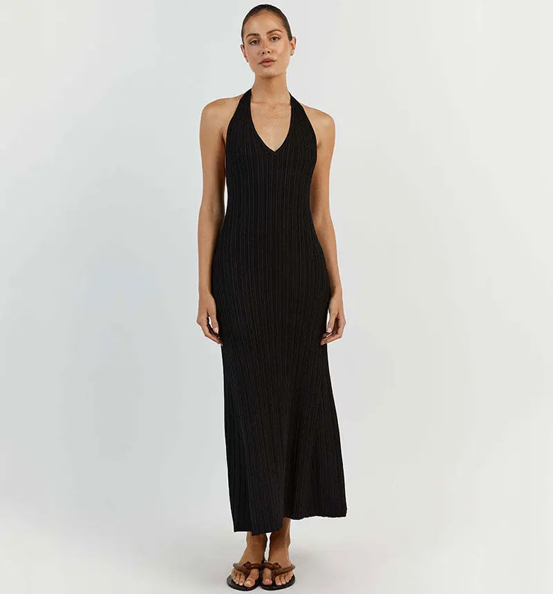 Knitted Backless Maxi Dress for Women Summer Sleeveless Holiday Party Sexy Halter Bodycon Long Dresses