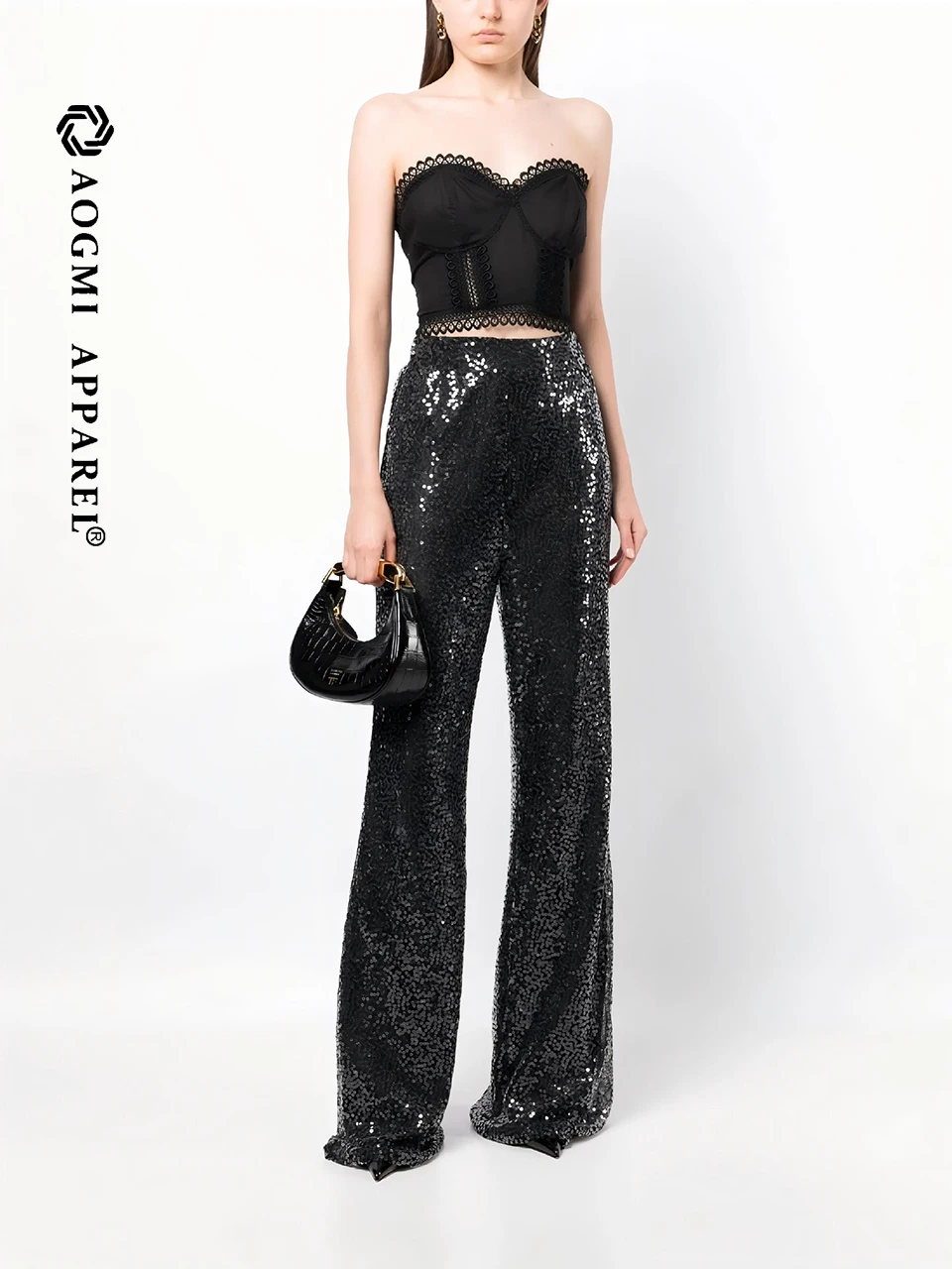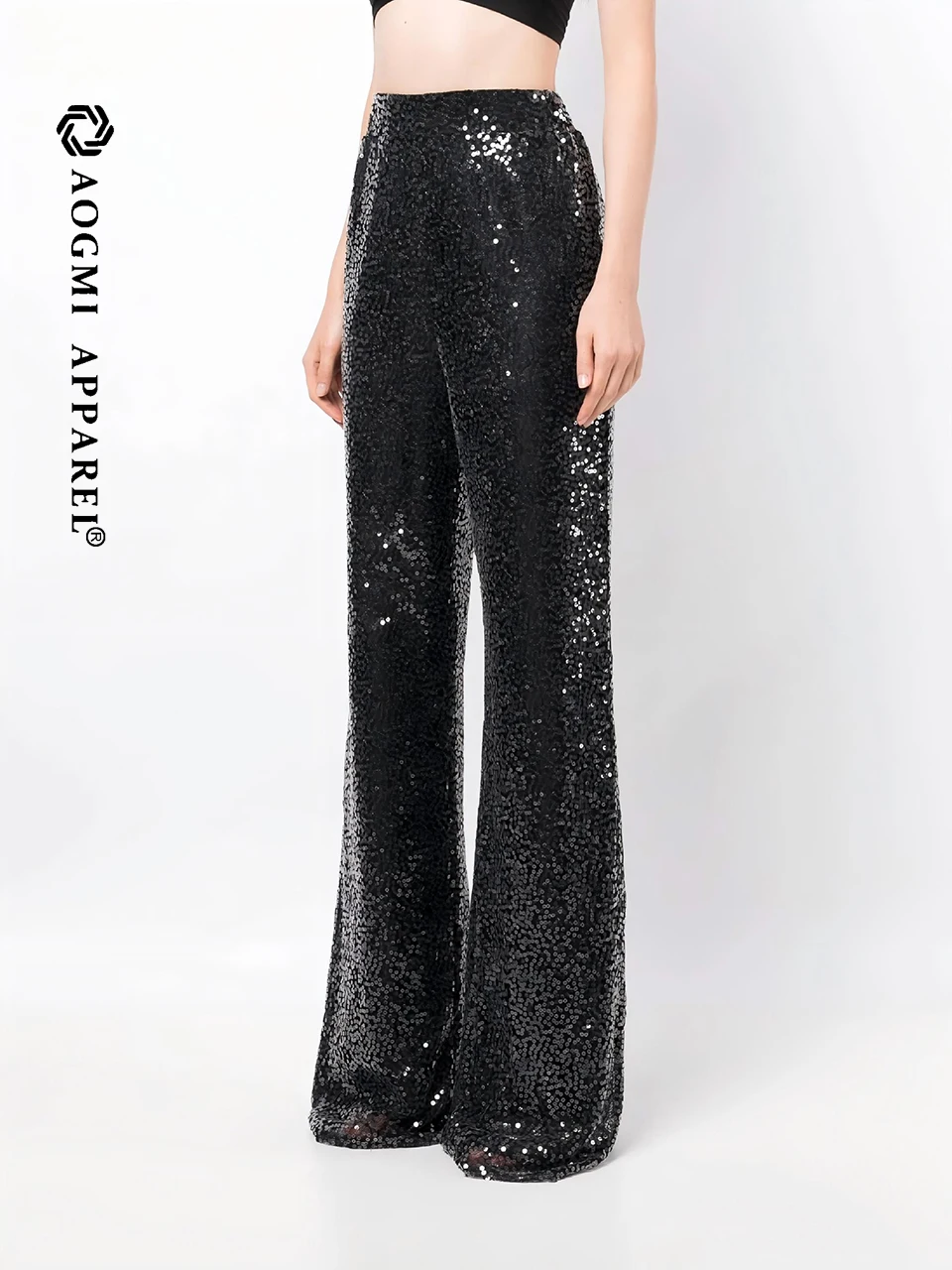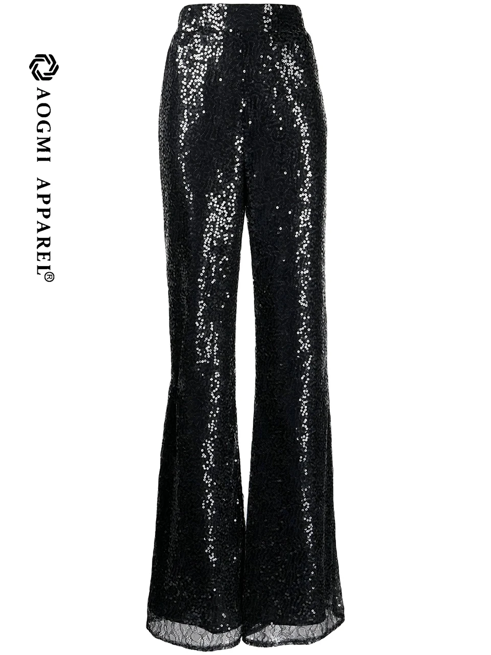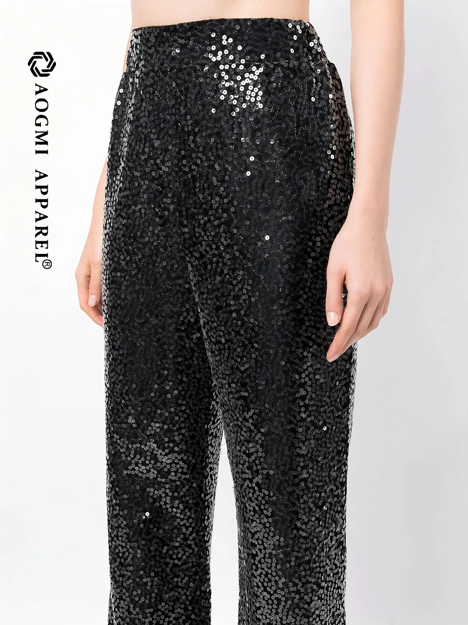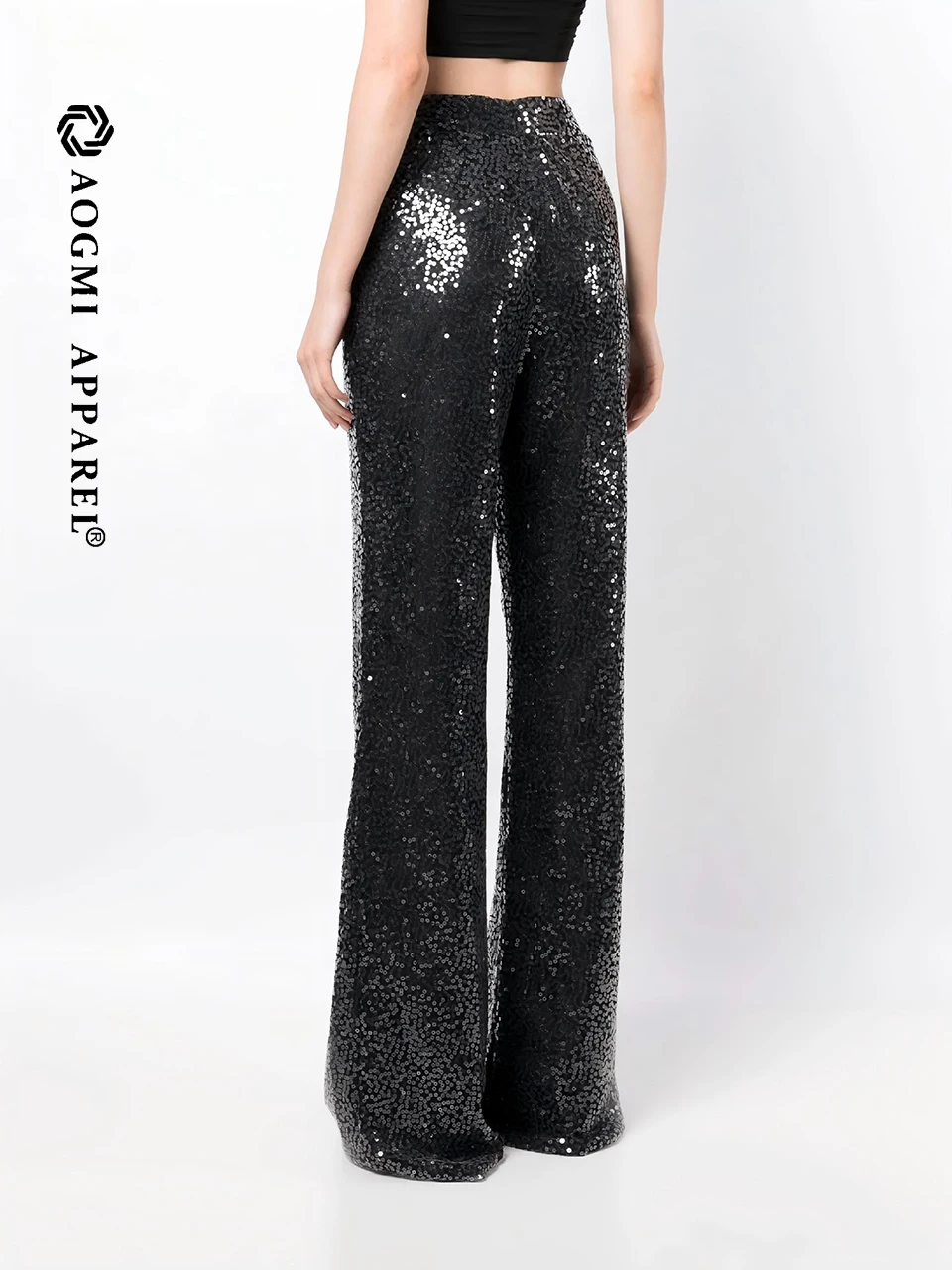 Haute Couture Fashion Ladies Solid Color 3D Sequin Embroidery High Elastic Waist Viscose/Polyester Casual Harem Trousers