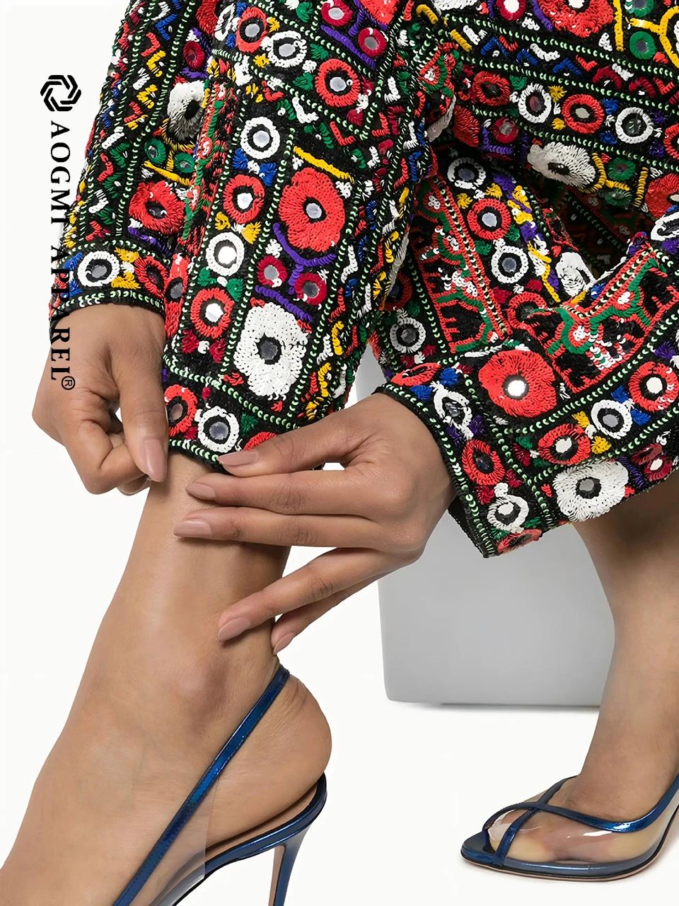 ZYHT 35239 Women's Elegant Black Velvet Blazer with White Ruffled Trim Peplum Hem & Long Puff Sleeves Chic Formal Jacket