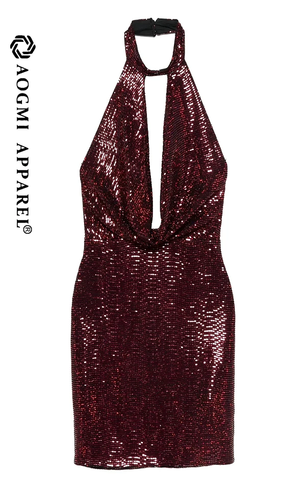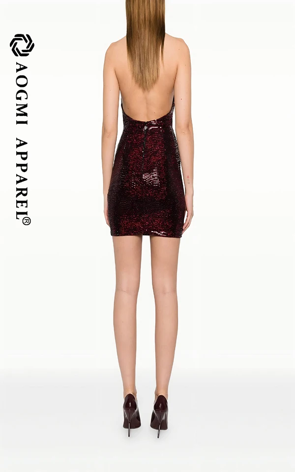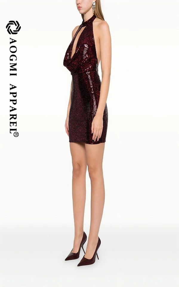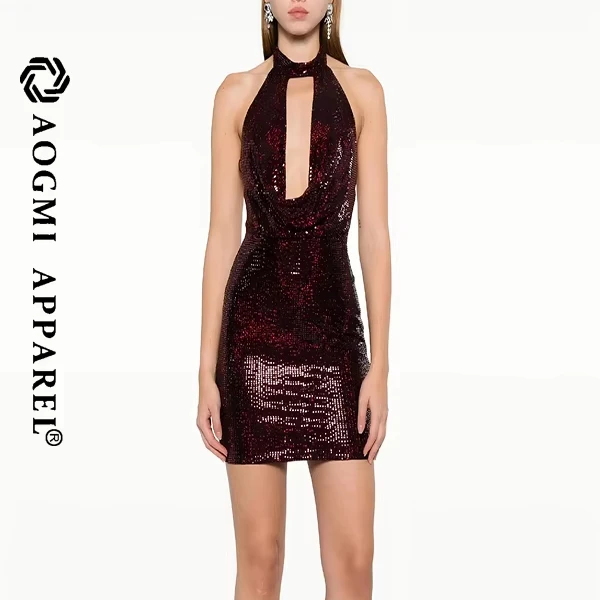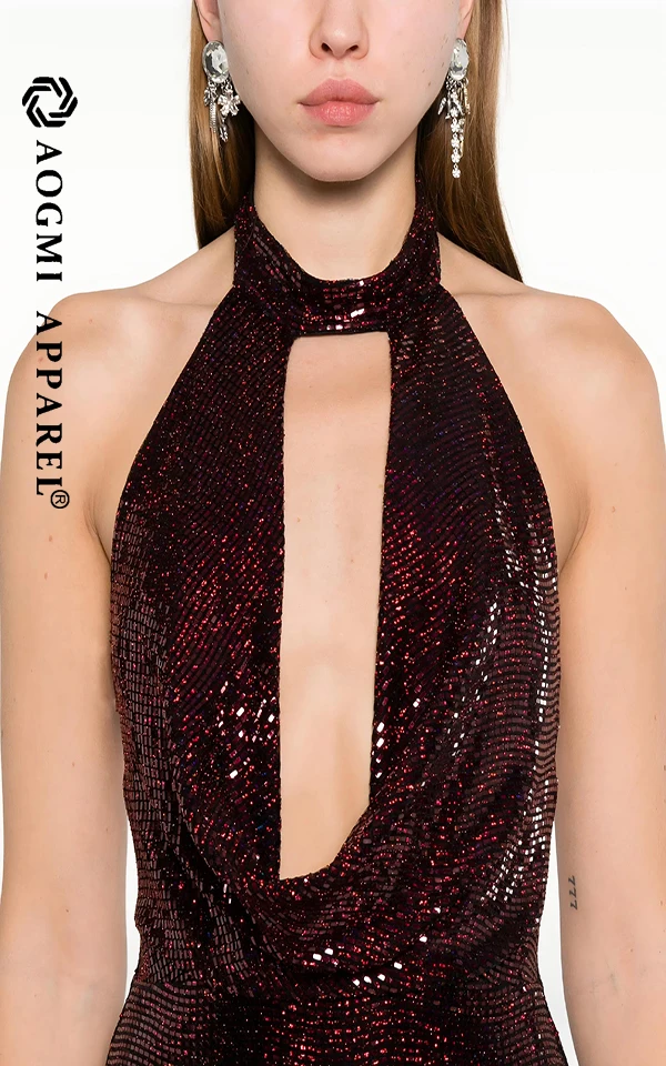 Haute Couture Eco-Friendly Fashion Ladies Summer New Design Sexy Backless Sequined Chiffon Halter Neck Sheath Gown Cut Cutout