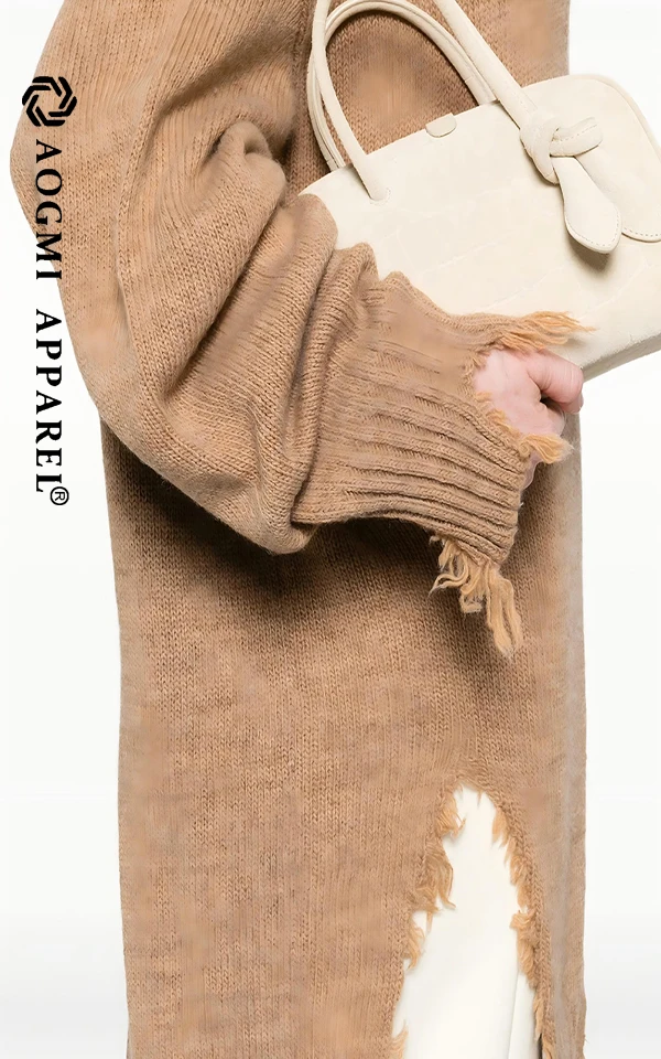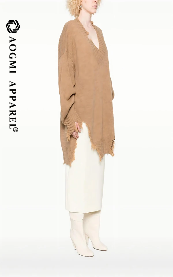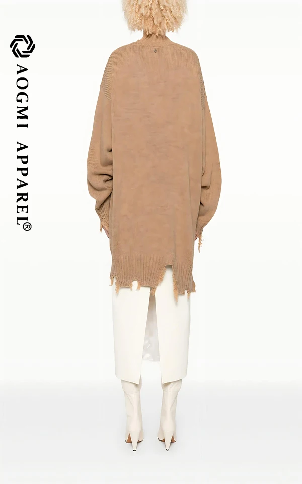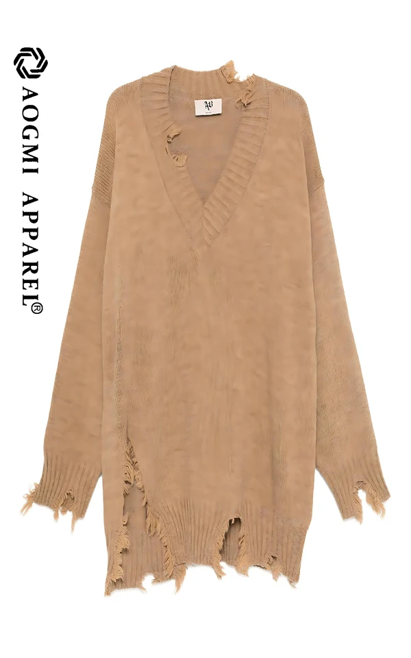 Haute Couture Fashion Ladies Broken-Hole Antique V-neck Sweater 100% Cotton Breathable & Anti-Wrinkle Autumn