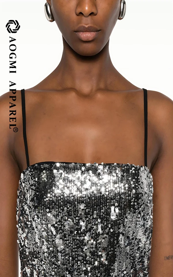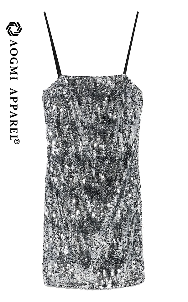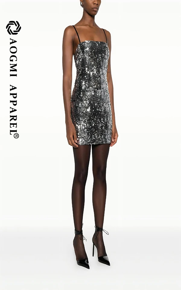 Haute Couture Fashion Ladies Sexy Mini Spaghetti Strap Square Neck Sequin Satin Breathable Anti-Wrinkle Eco-Friendly Dress