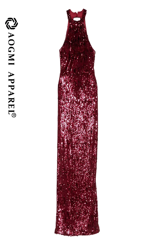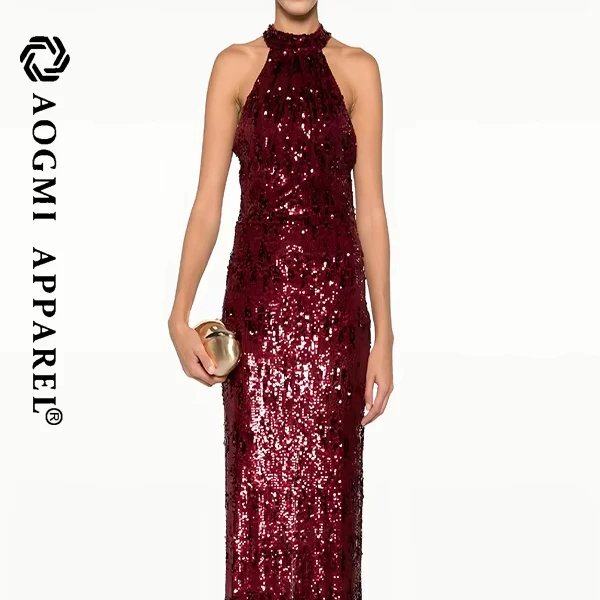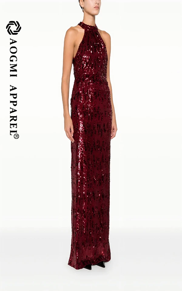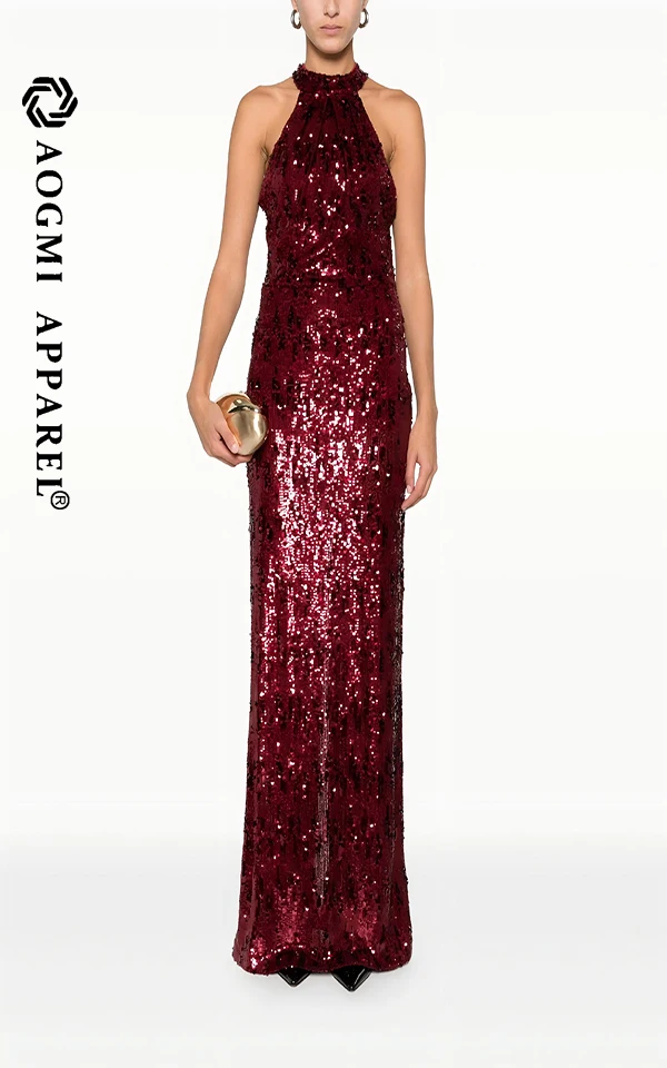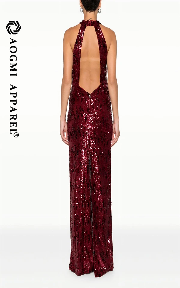 Haute Couture Fashion Ladies Halter Neck Sequins Solid Color Back Hollow Sleeveless Eco-Friendly Chiffon Floor-Length Dress