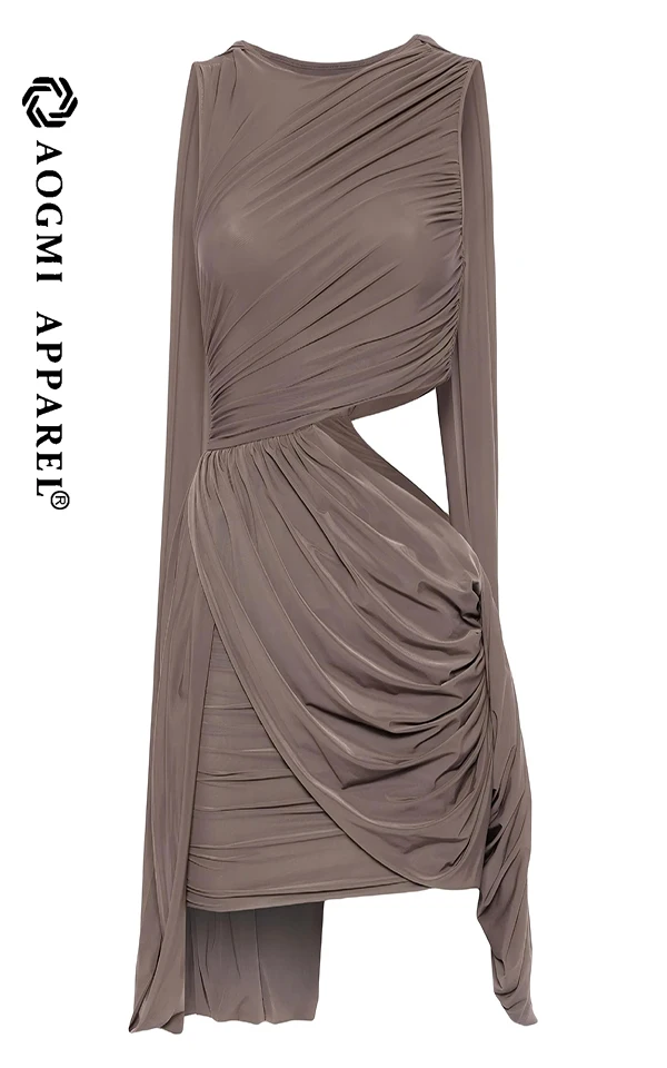 ZYHT 73849 European Wholesale Fashion Casual One Shoulder Ruched Maxi Dress Side Slit Pleated Long Sleeve Dresses for Women