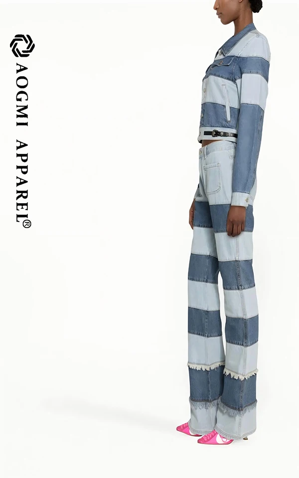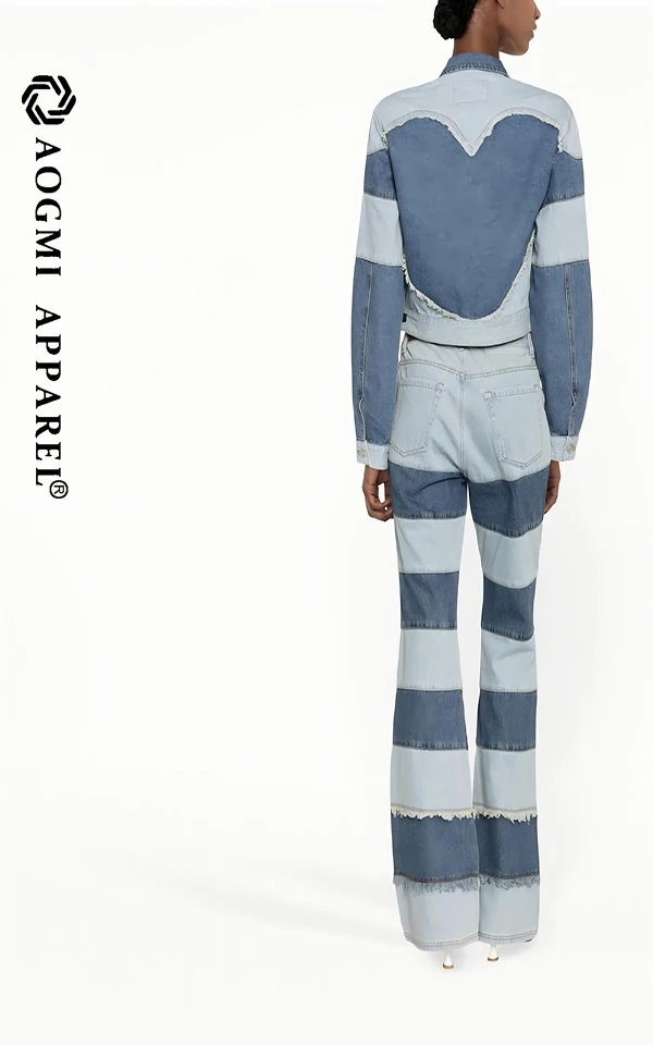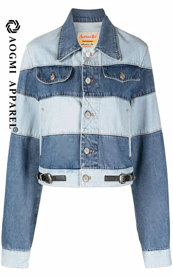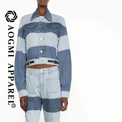 Haute Couture Fashion Ladies Retro Washed Denim Jacket Women Inelastic Paneled Color Block Blue Faded Nonwoven Fabric Turtleneck