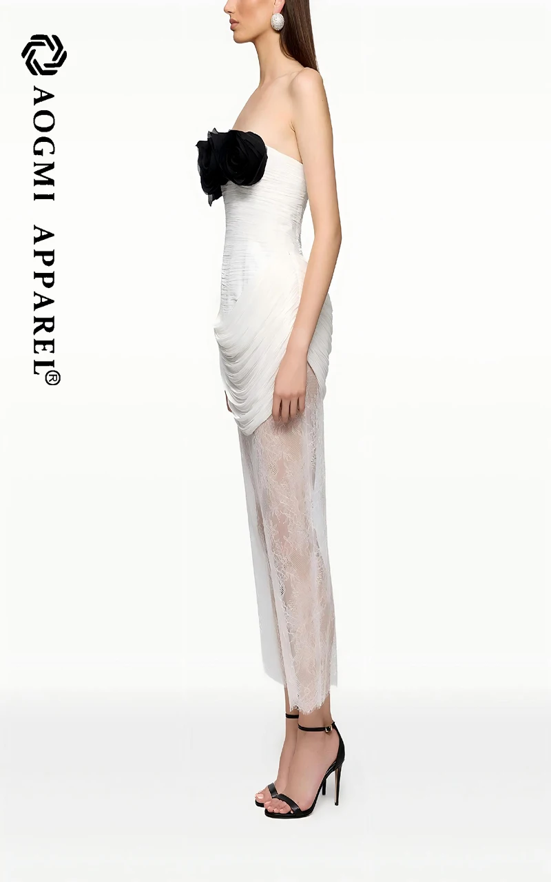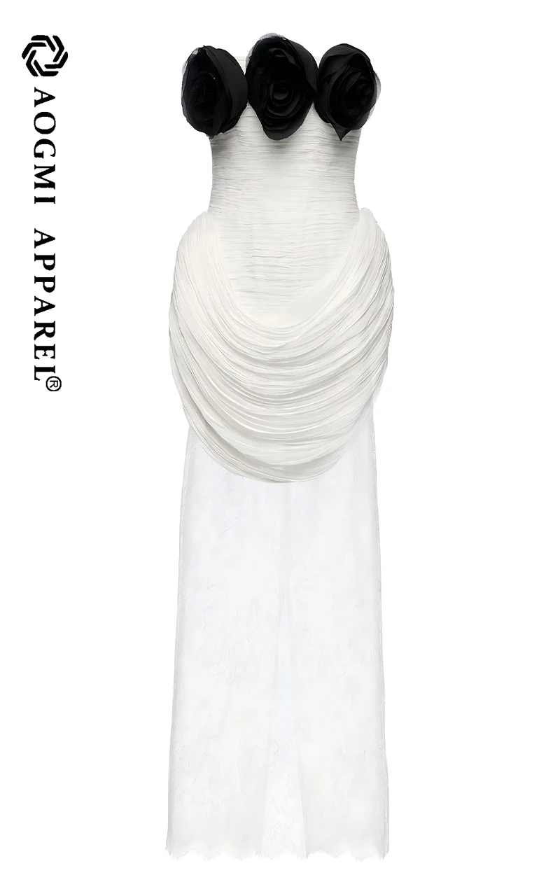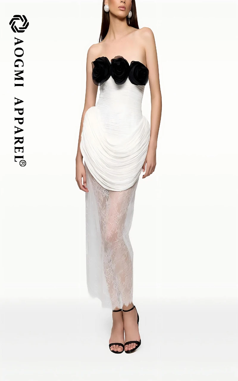 Haute Couture Luxury Fashion Ladies 3D Flower Pleated Satin Fabric Stitching Mesh Sleeveless Knee-Length A-Line Dress
