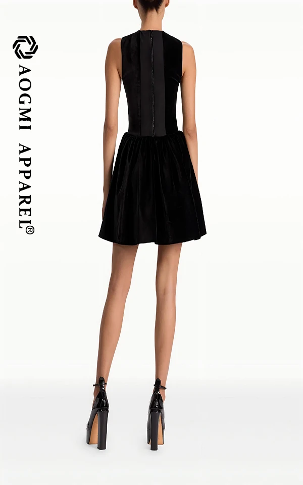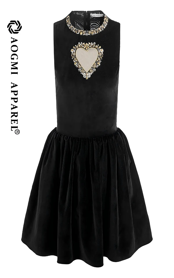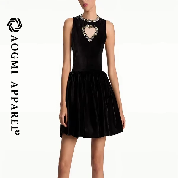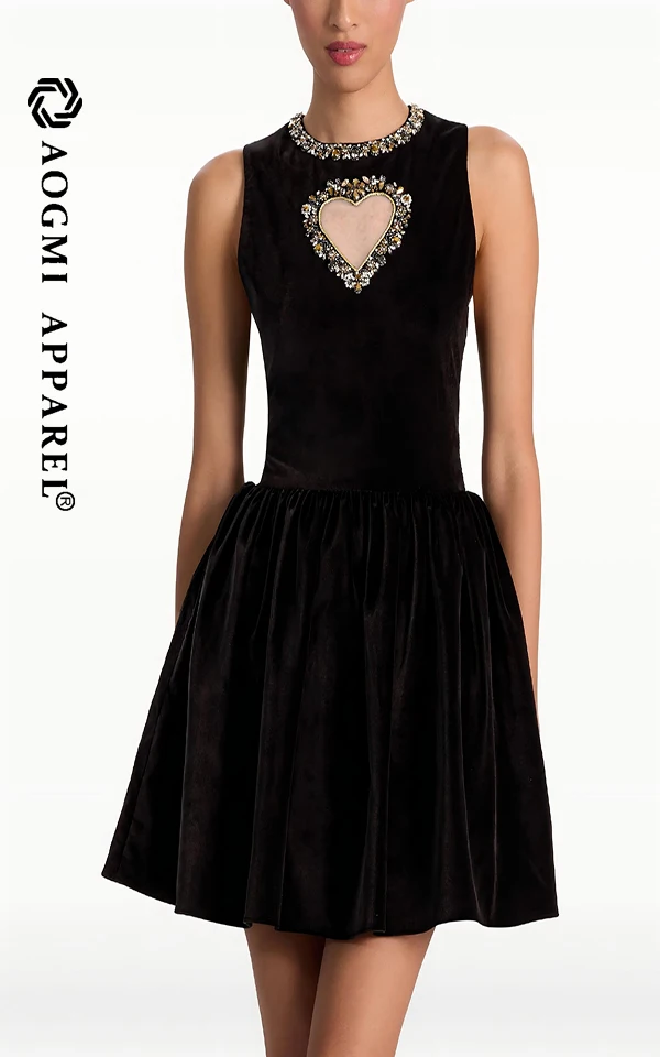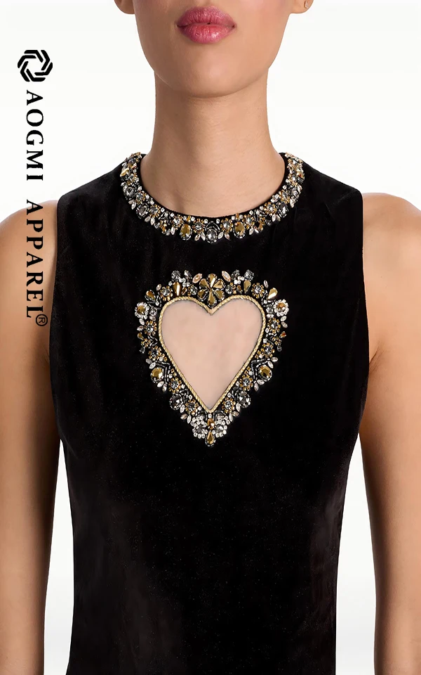 Haute Couture Fashion Ladies Sleeveless A-Line 100% Cotton Satin Eco-Friendly Heart Diamond Trim Charm Hollow Rhinestone Dress