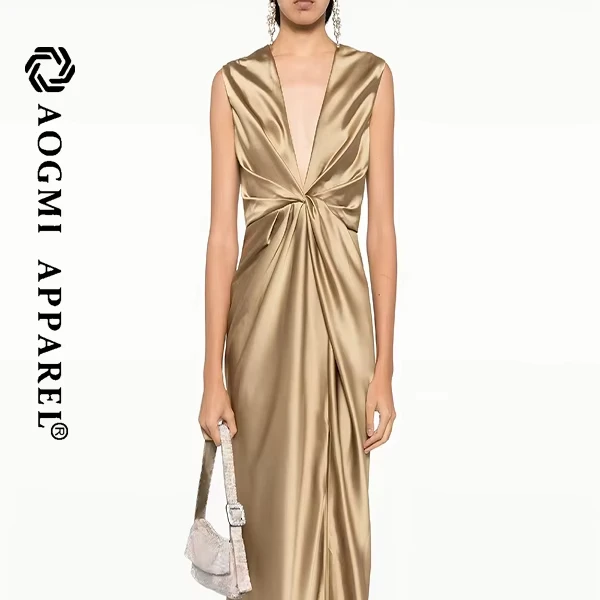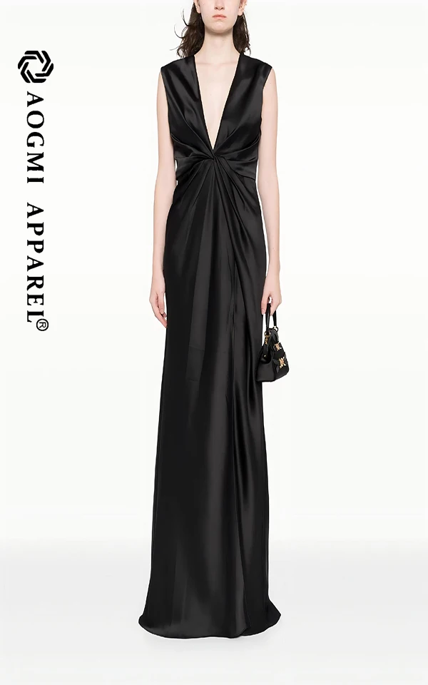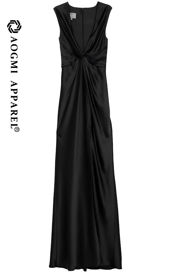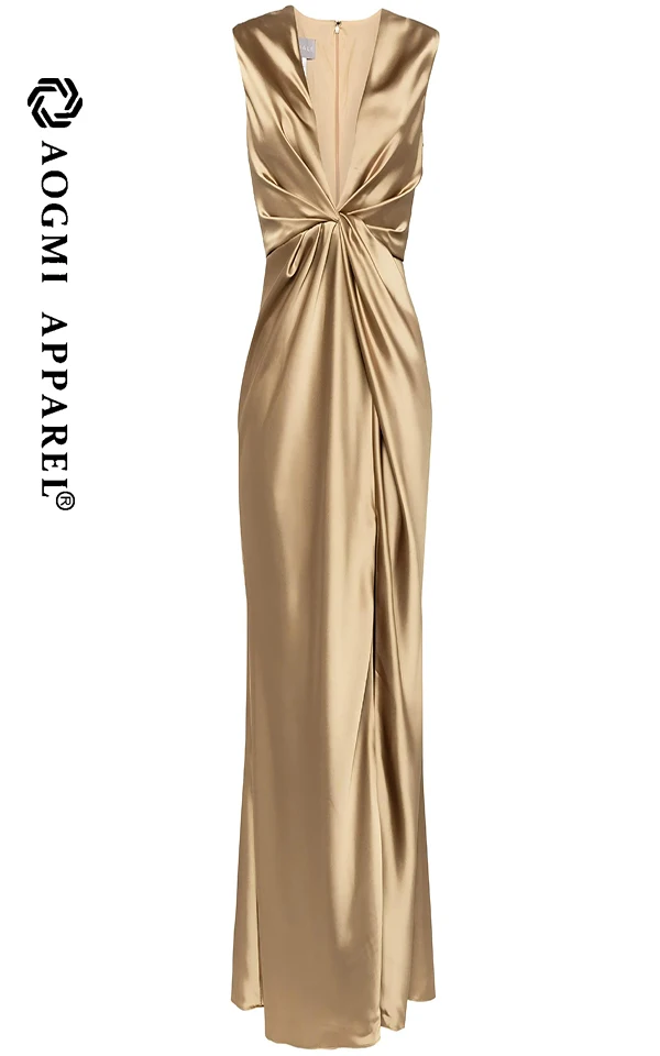 AOGMI Haute Couture Luxury Fashion Ladies Sleeveless Pleated Taffeta Sheath Floor-Length Dress 100% Silk