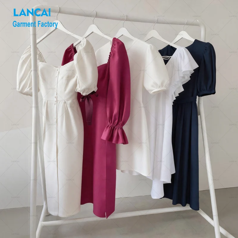 Customizable Women's Dresses Collection Trendy Styles Square Neck Puff Sleeve Ruffled Belted Dresses OEM ODM B