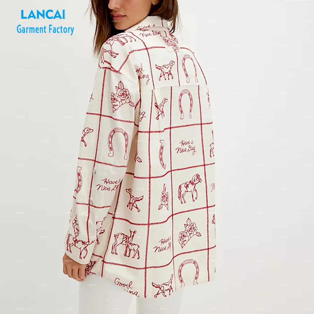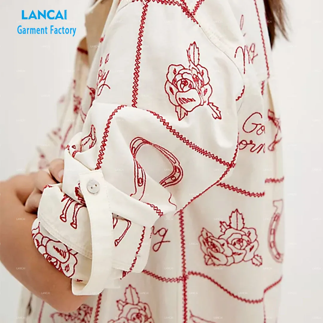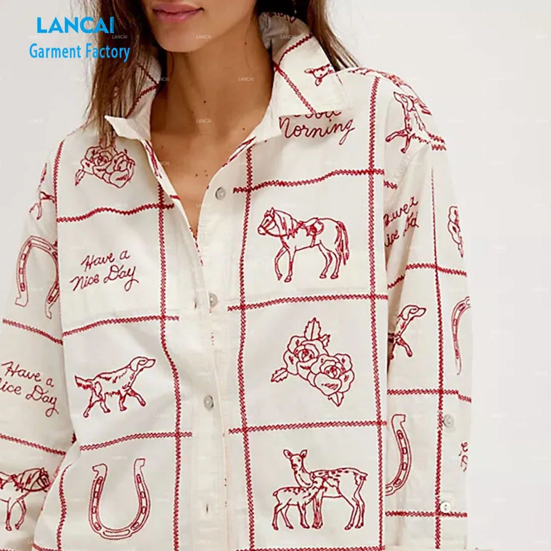 Women's Oversized Cotton-Linen Graphic Embroidery Button-Down Blouse Breezy Collared Neckline Button-Front Closure Button Cuffs