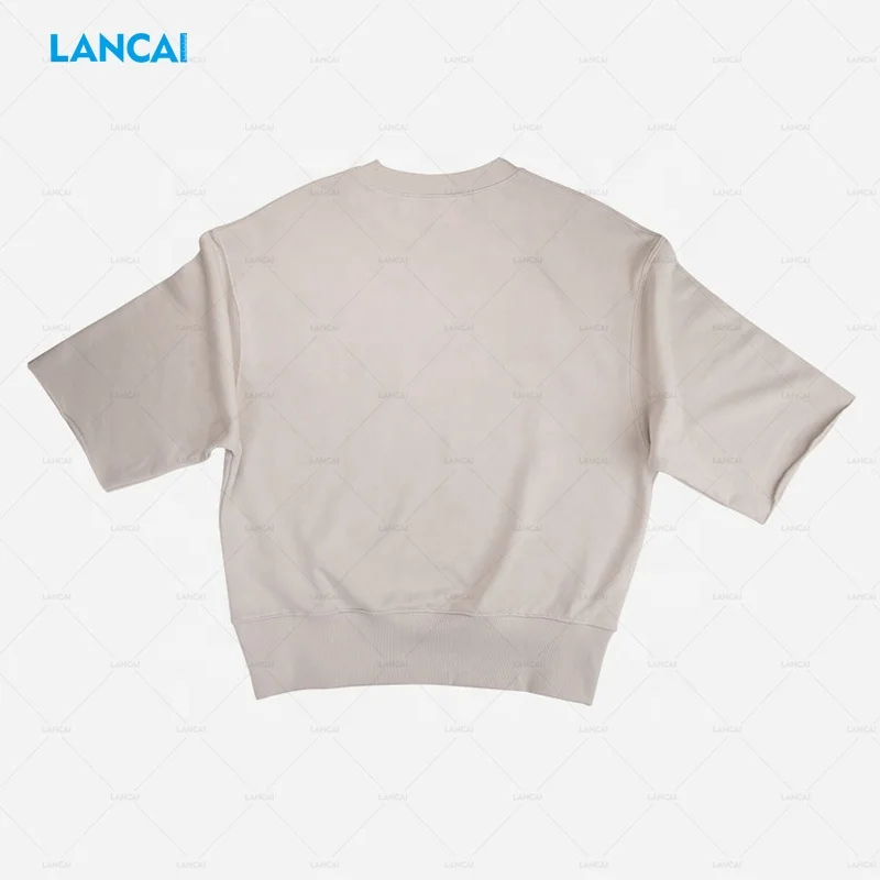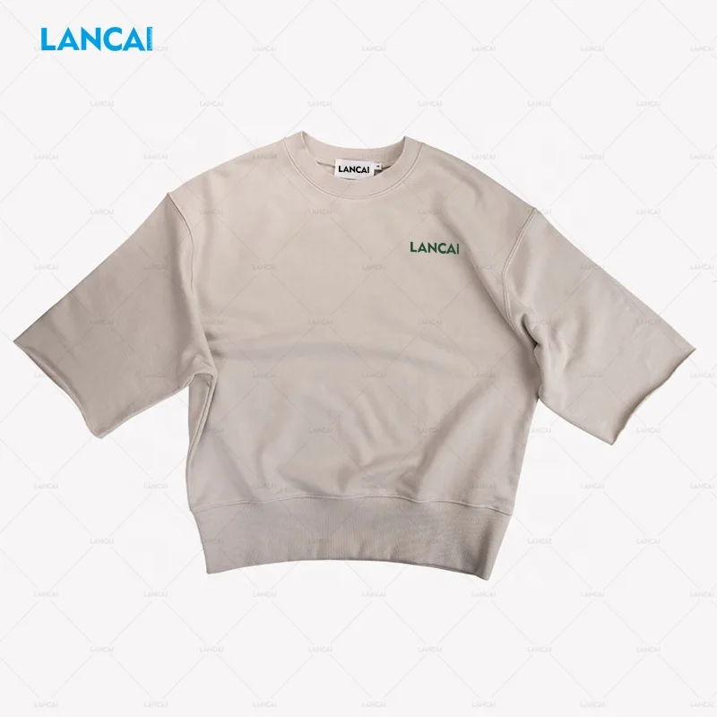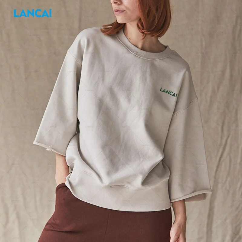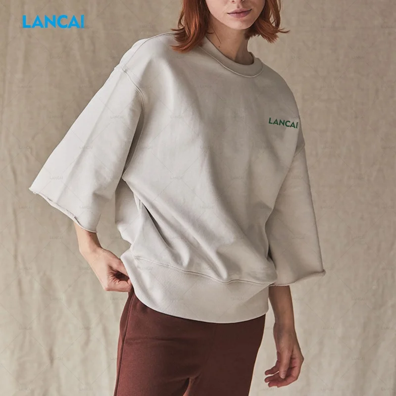 Clothing Manufacturer Customized High Quality Oversized Boxy Fit Raw Cut 3/4 Sleeve Beige Sweatshirts For Women