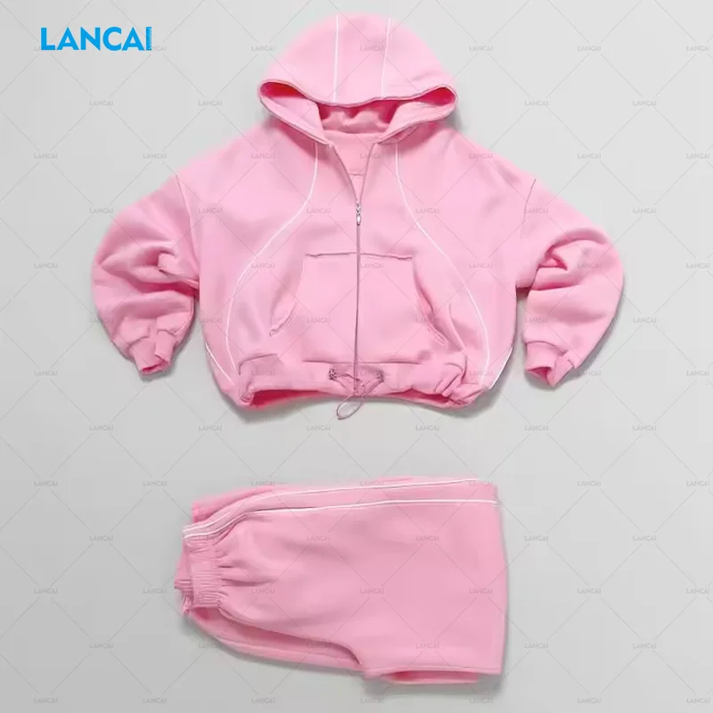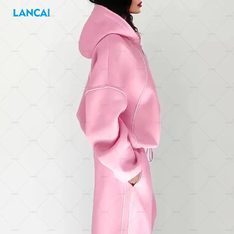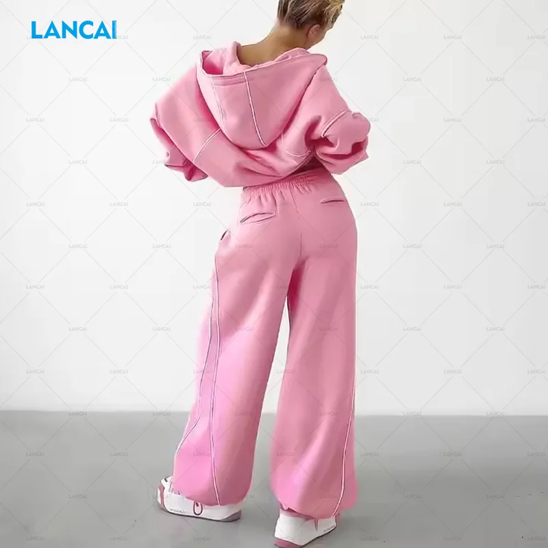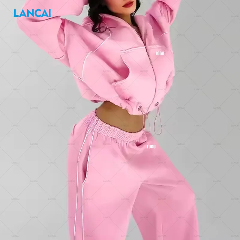 Customized Women's Two Piece Set Oversized Pink Cropped Zip Up Hoodie Jacket Wide Leg Pants Casual Sporty Streetwear Tracksuit