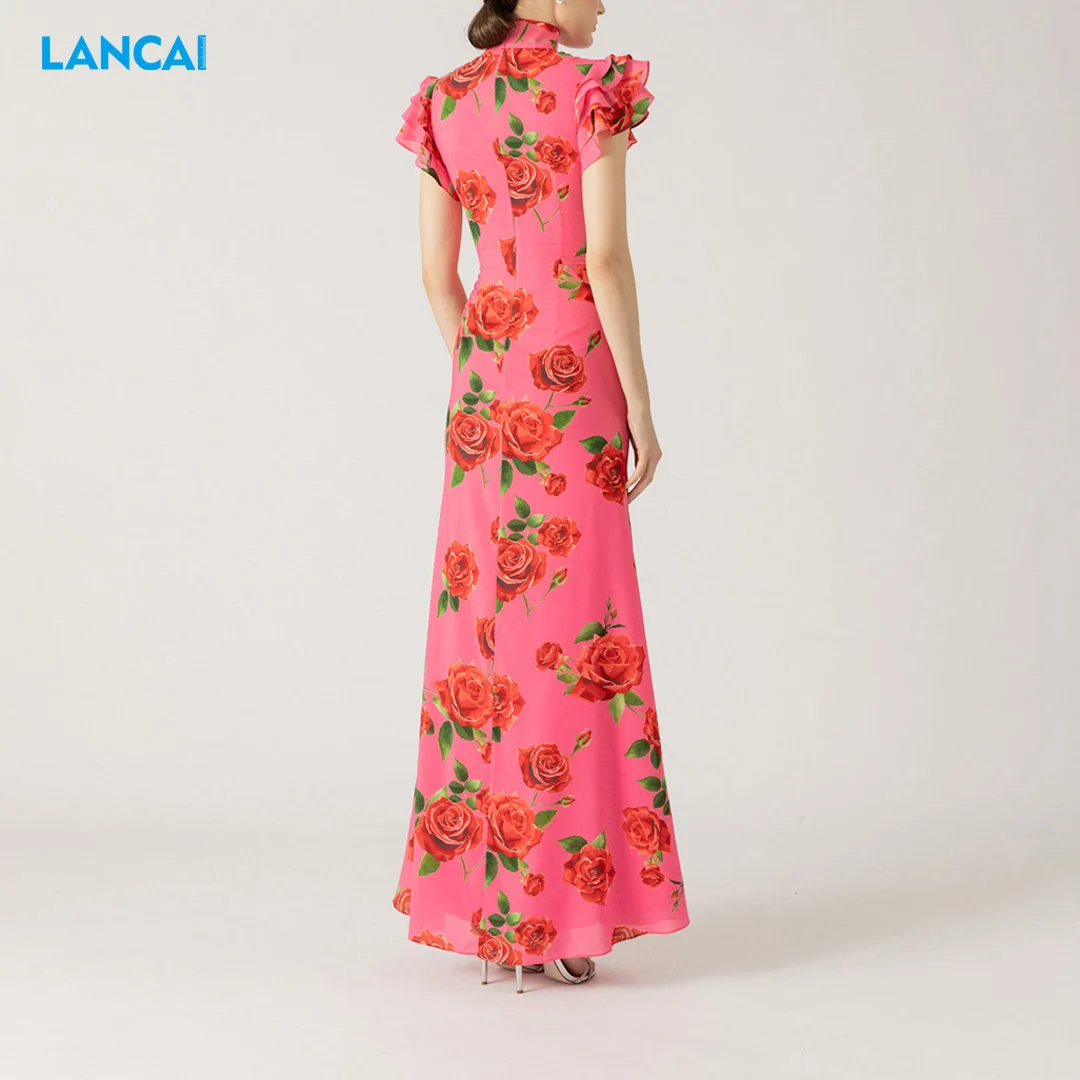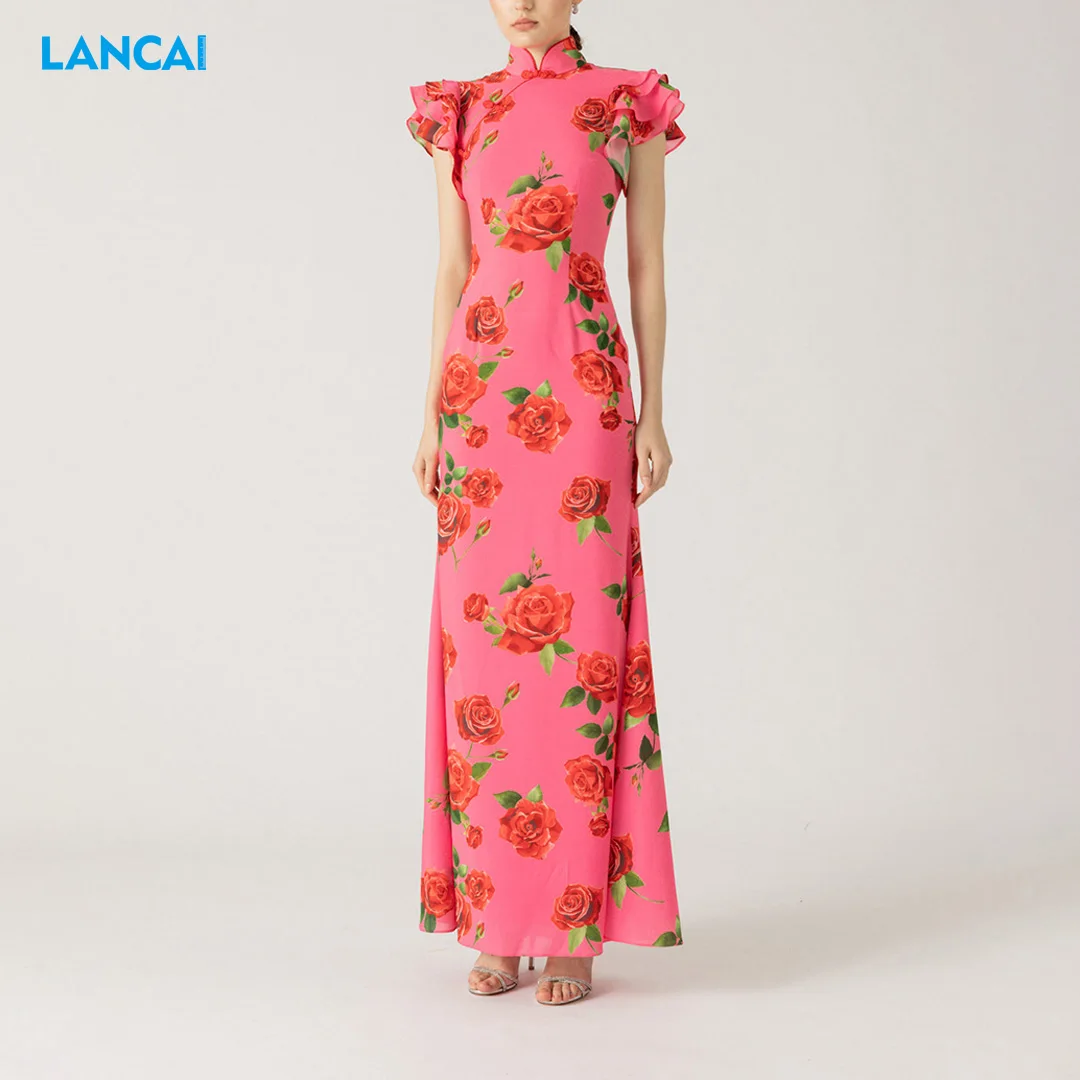 Summer Fashion O Neck Sleeveless Floral Print Satin Maxi Long Dress