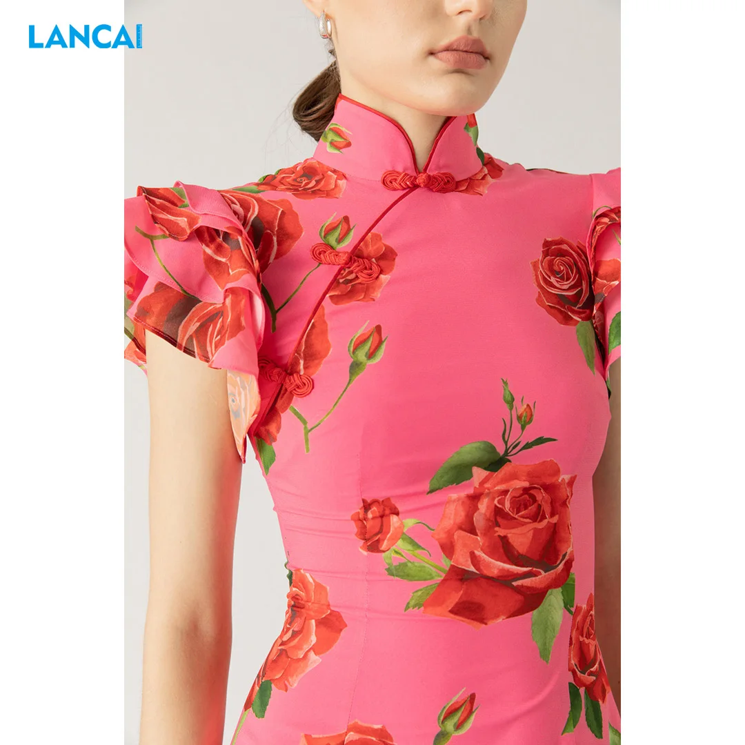 ZYHT 73957 Hot Selling Women Lady Printed Satin Beige Mermaid Fish Tail Floor Length Party Cocktail Evening Dress Gown