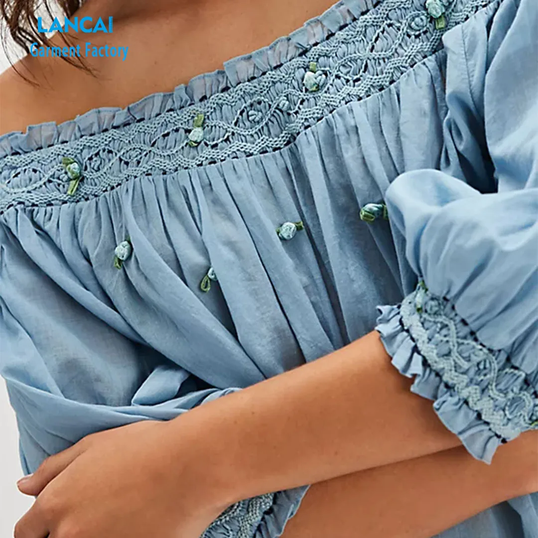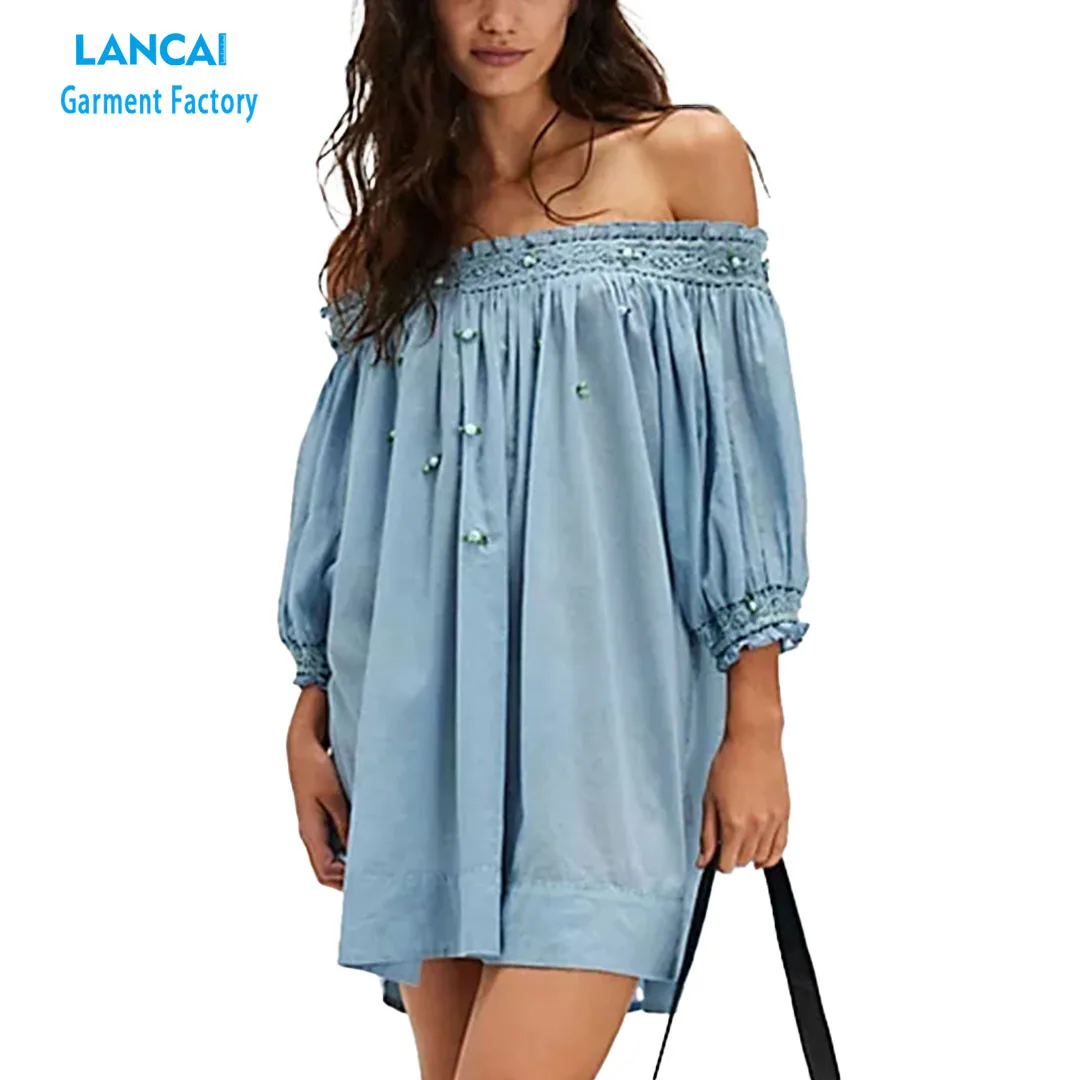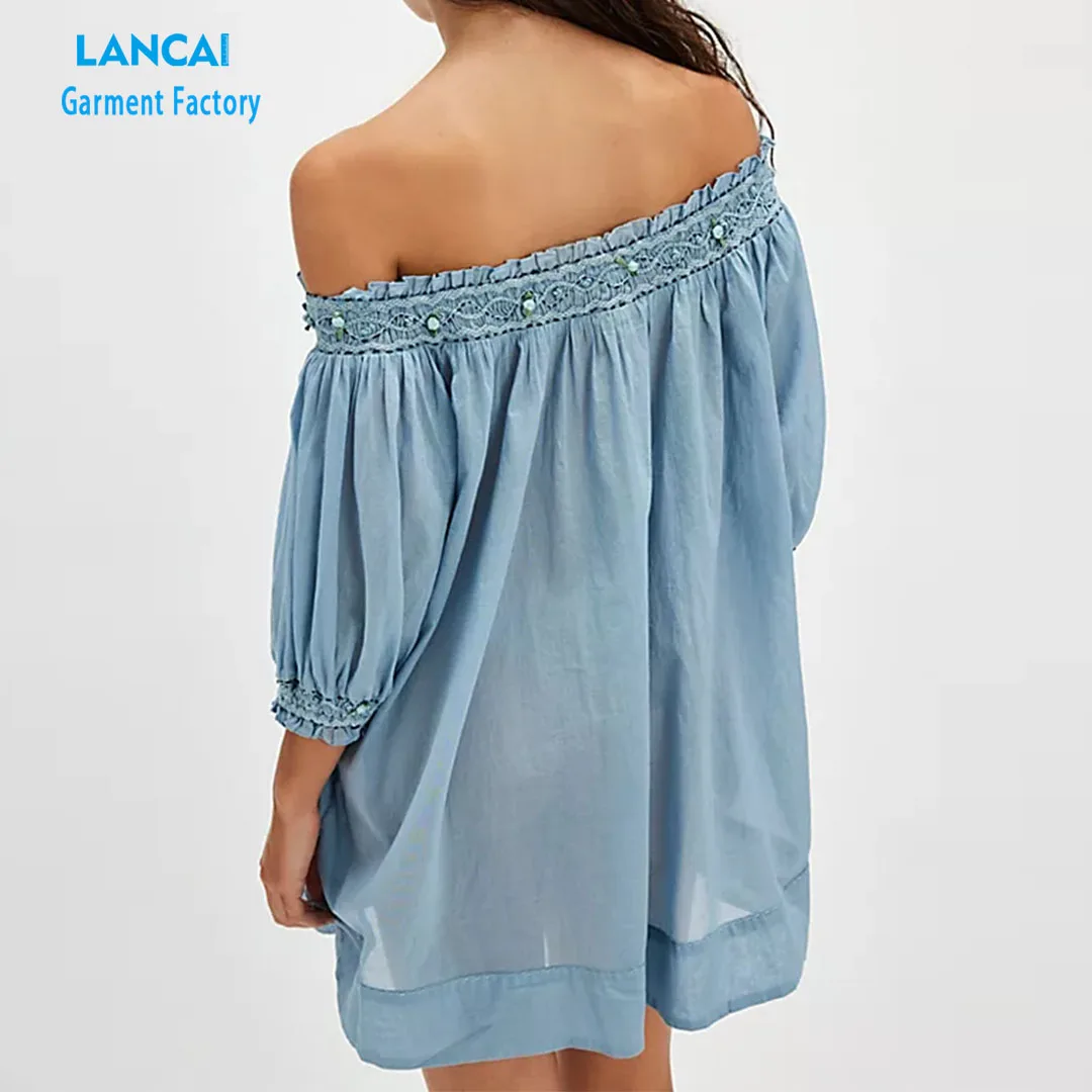 Custom Logo Blouson Sleeves Regular Fit Mini Dress Single Style Causal Off Shoulder Dress