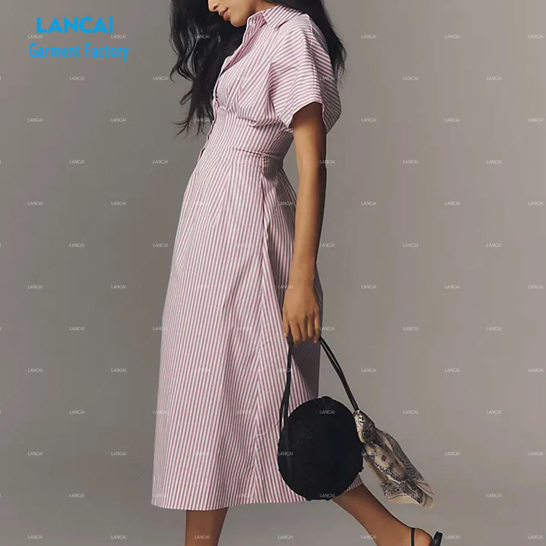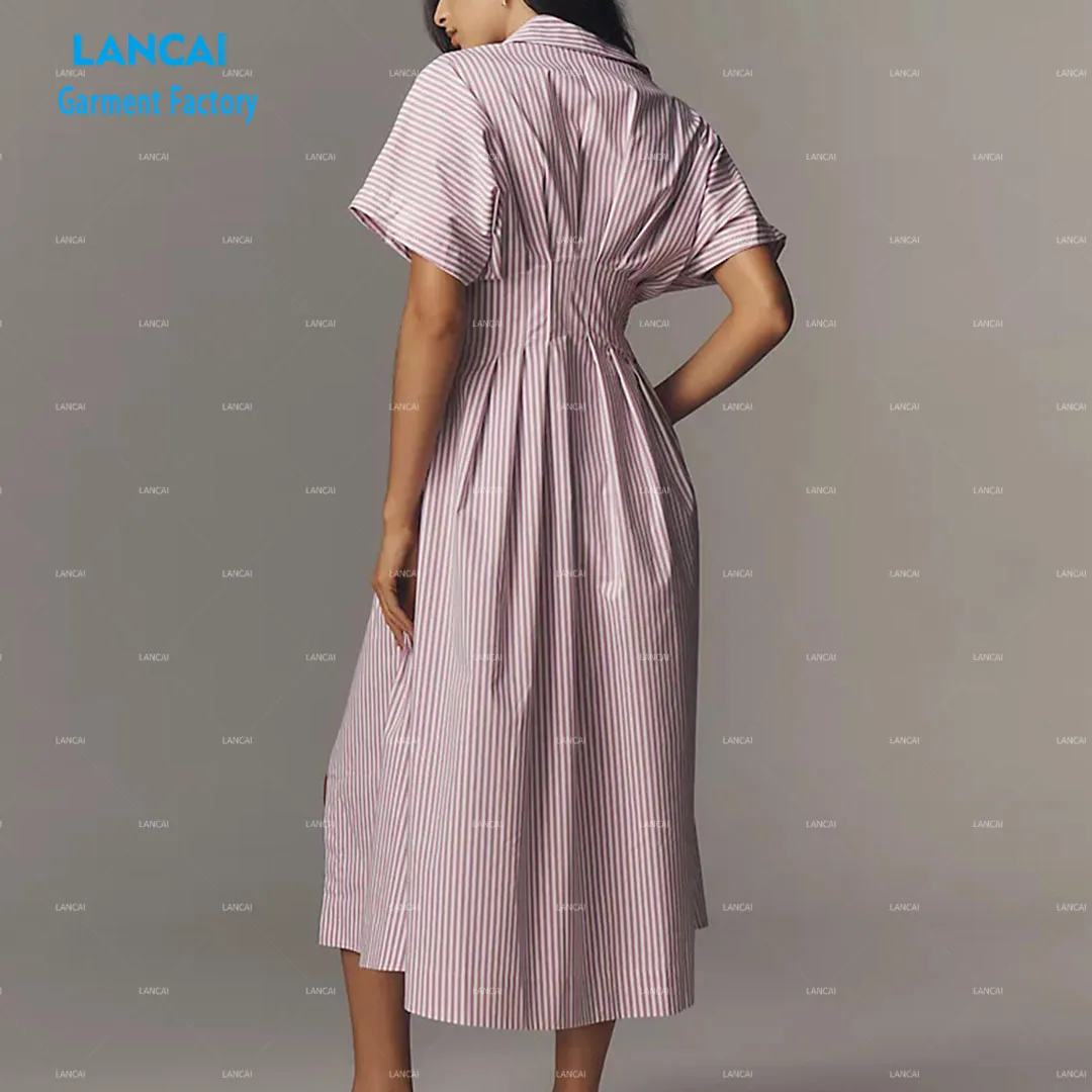 Custom Clothing Design Manufacturers Women Cotton Striped Turn Down Collar Shirt Dress High Waist Short Sleeve Casual Dress