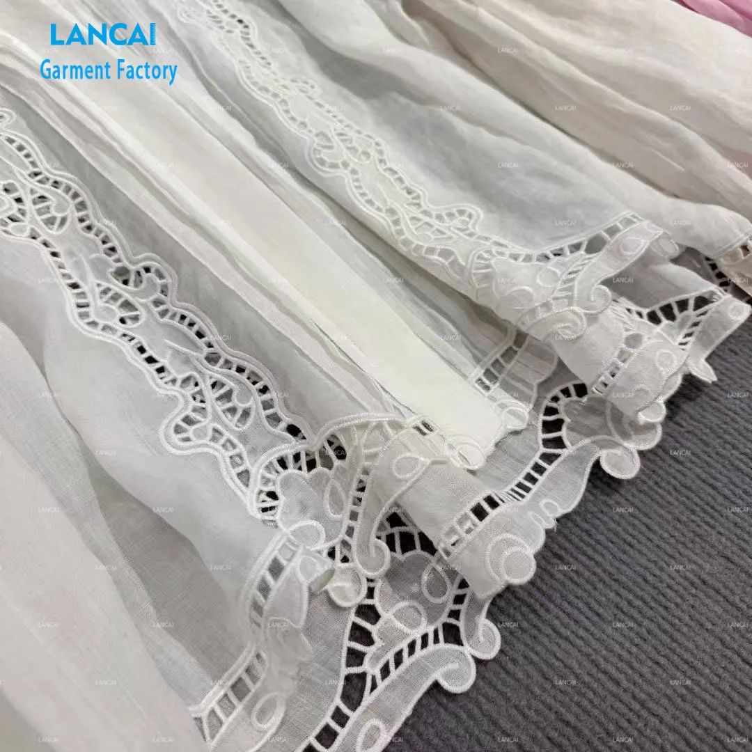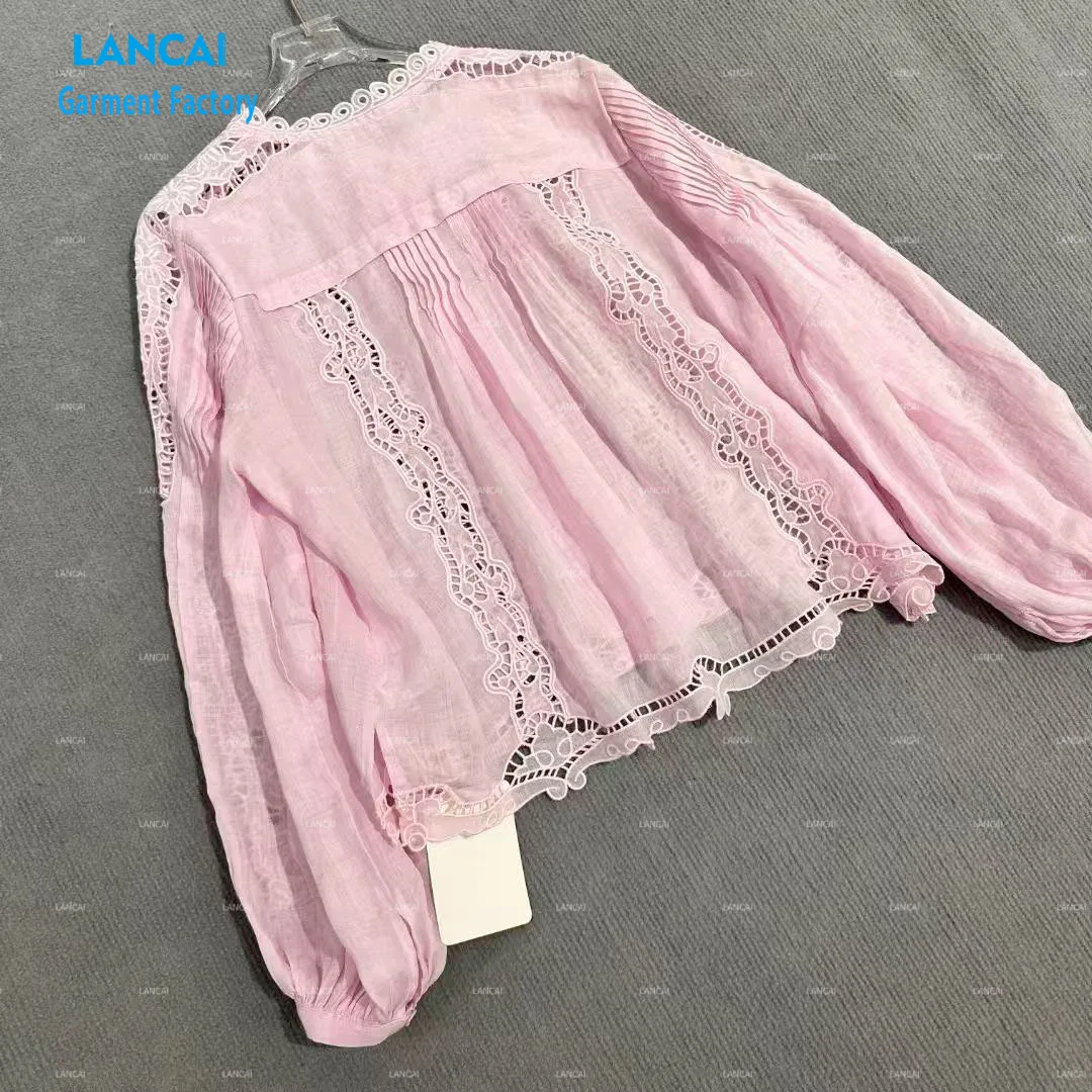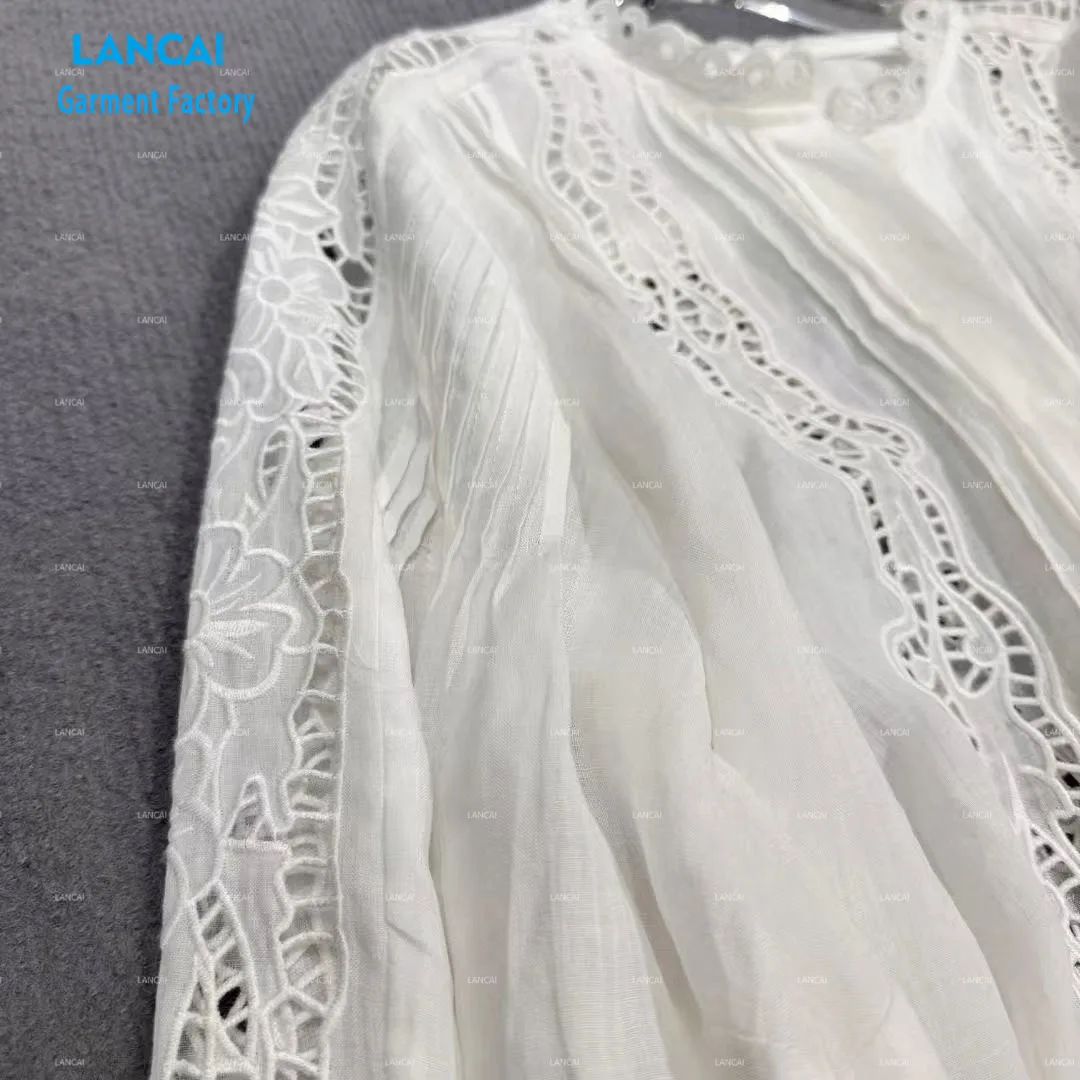 Women's Casual Blouse Embroidered Cut-Out Neck Trimming Ruched Balloon Sleeves Button Closure Front Back Sleeve Pleating