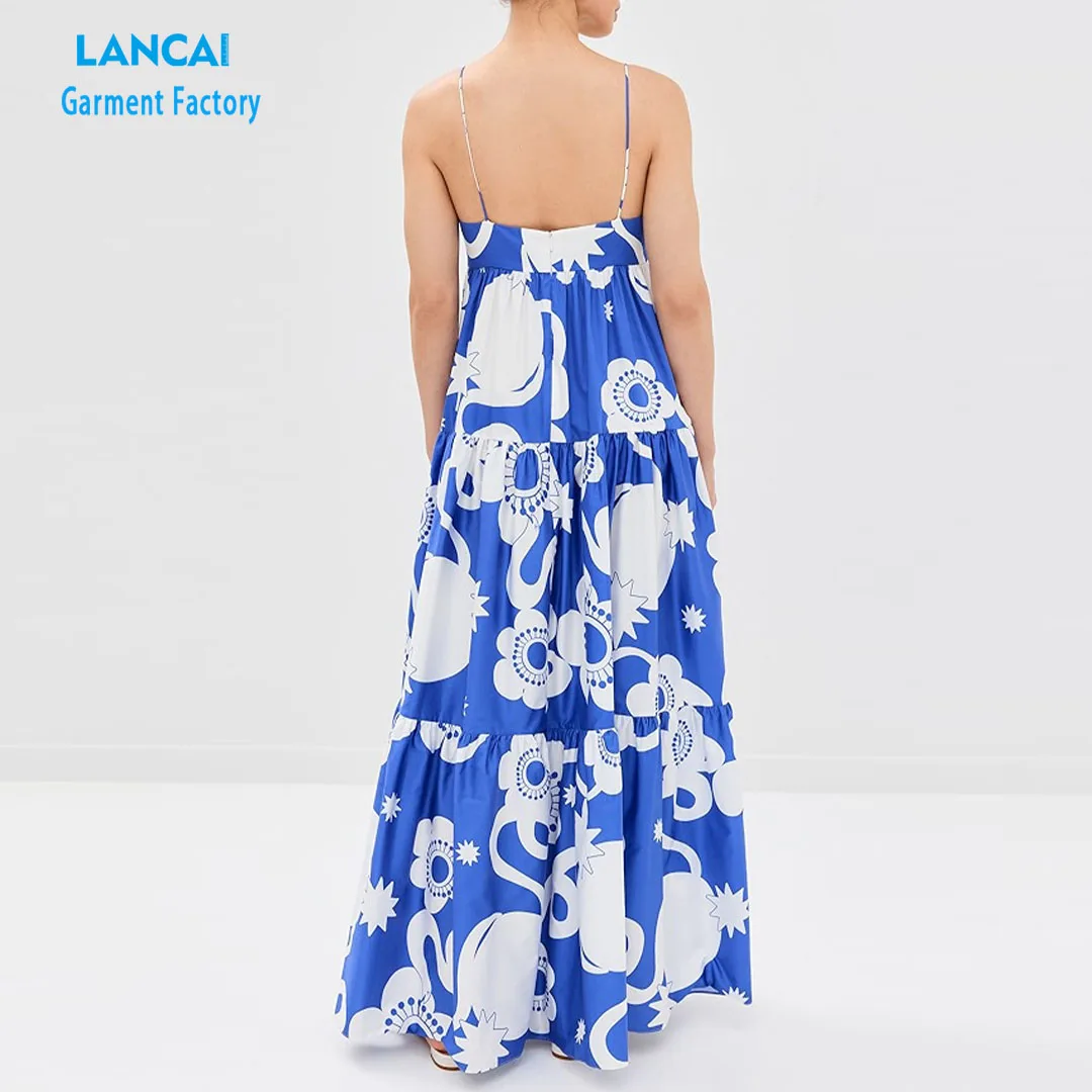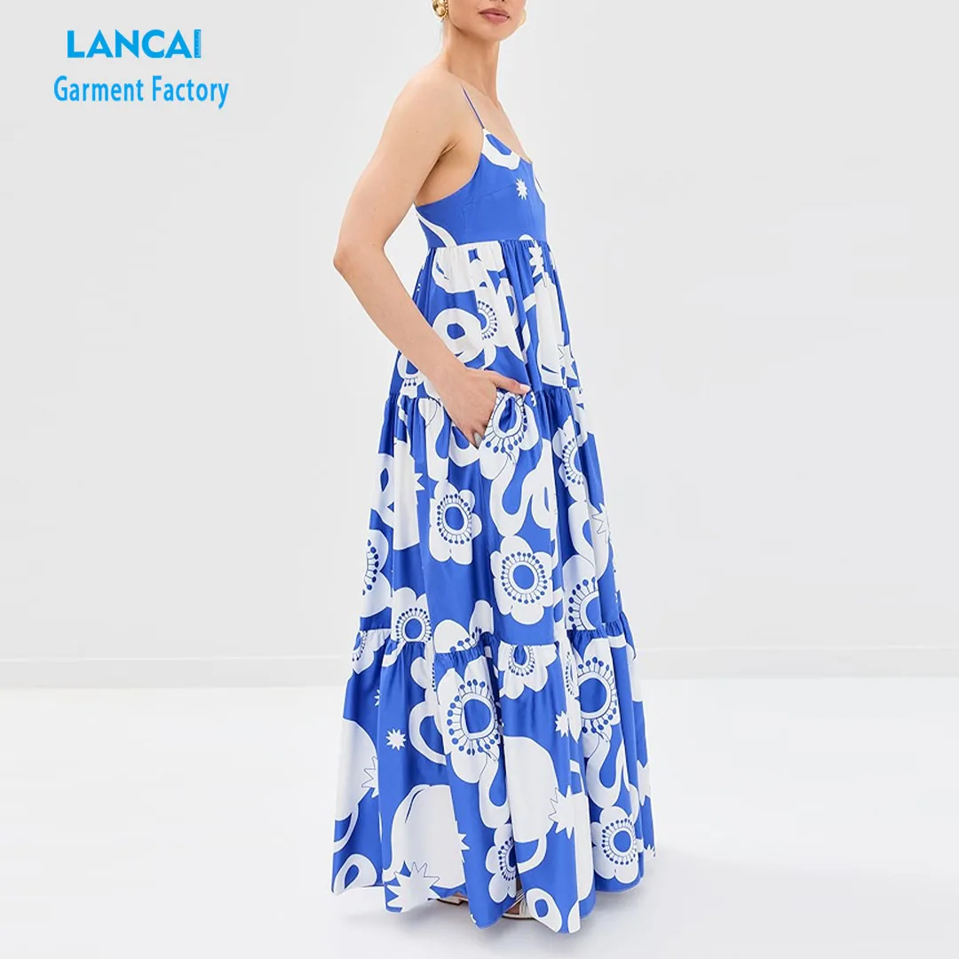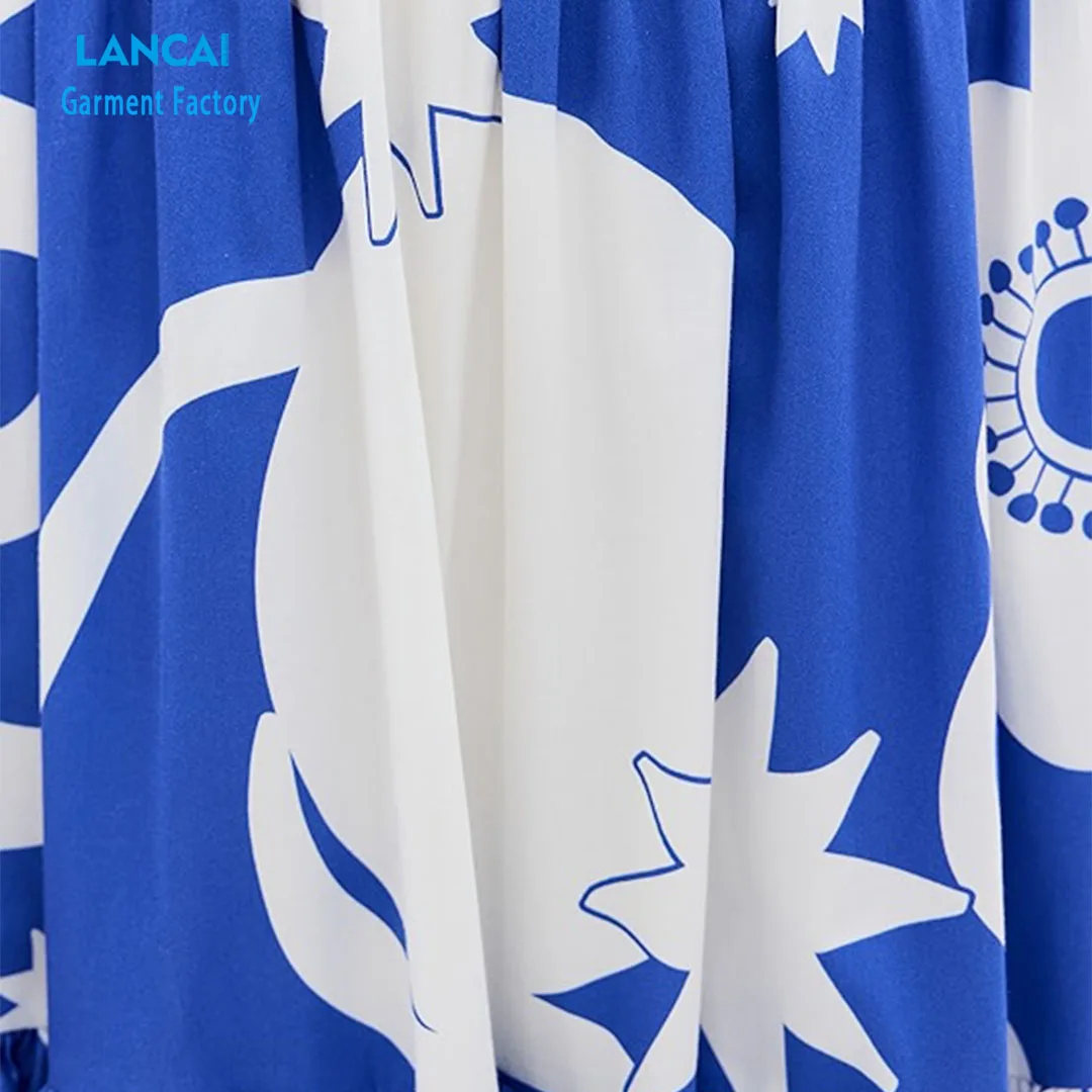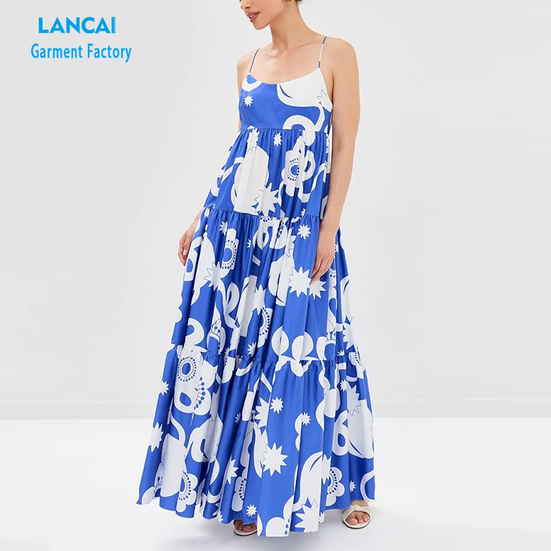 Women's Long Dress White Pattern Sky Blue Colors square Neck Sleeveless Modal Fabric Comfortable Clothing Customized
