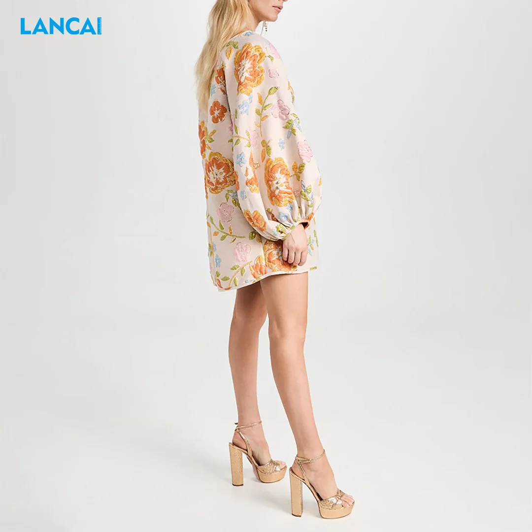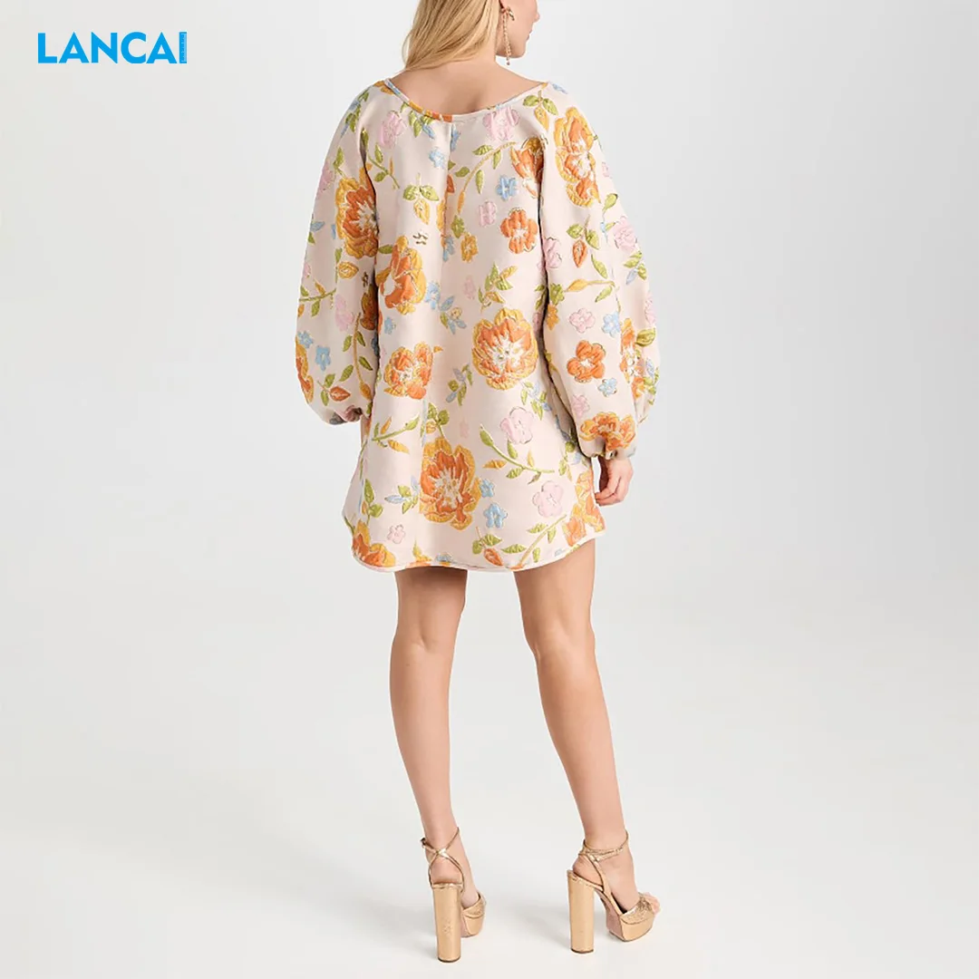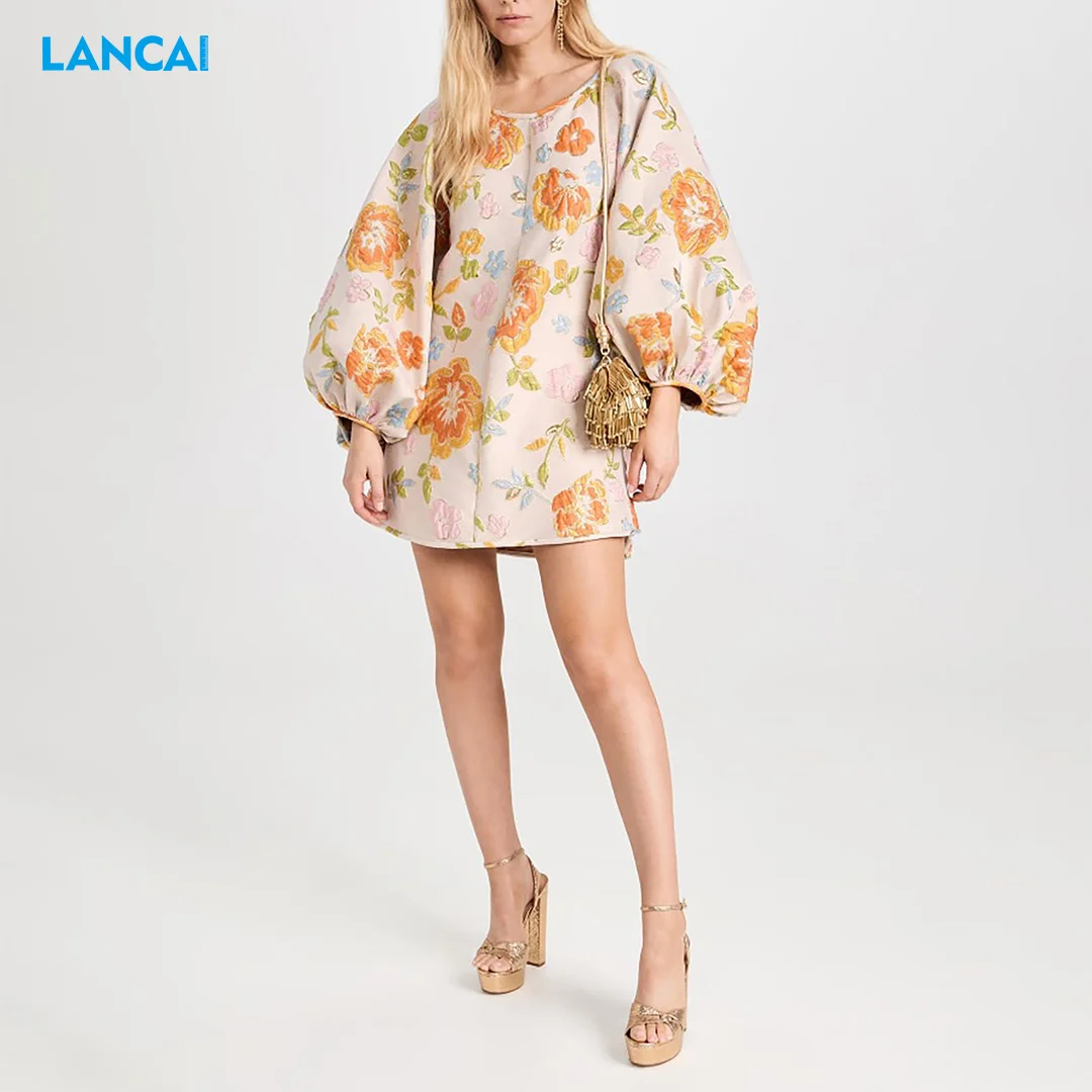 Wholesale Vintage Women Plus Size Fat Puff Long Sleeves Jacquard a Line Beach Dresses
