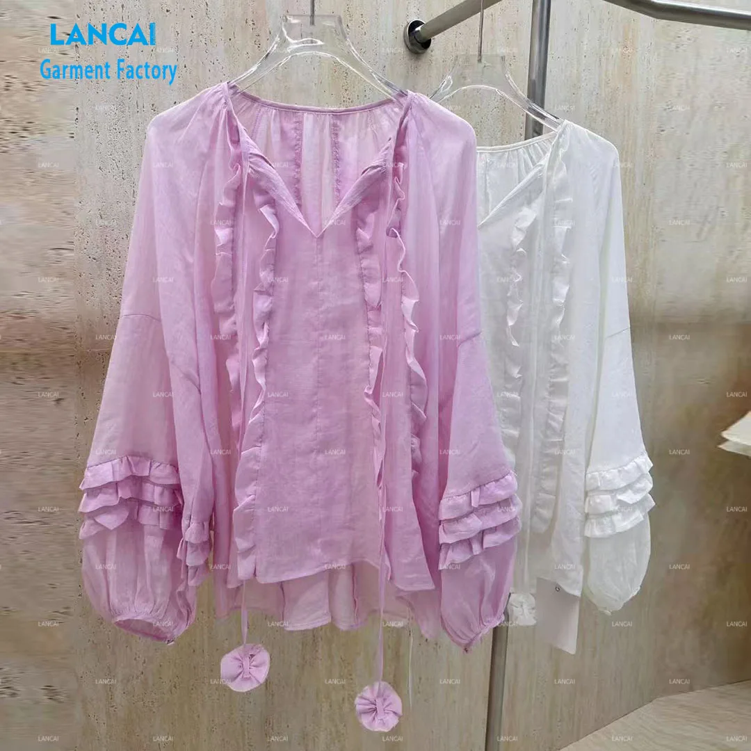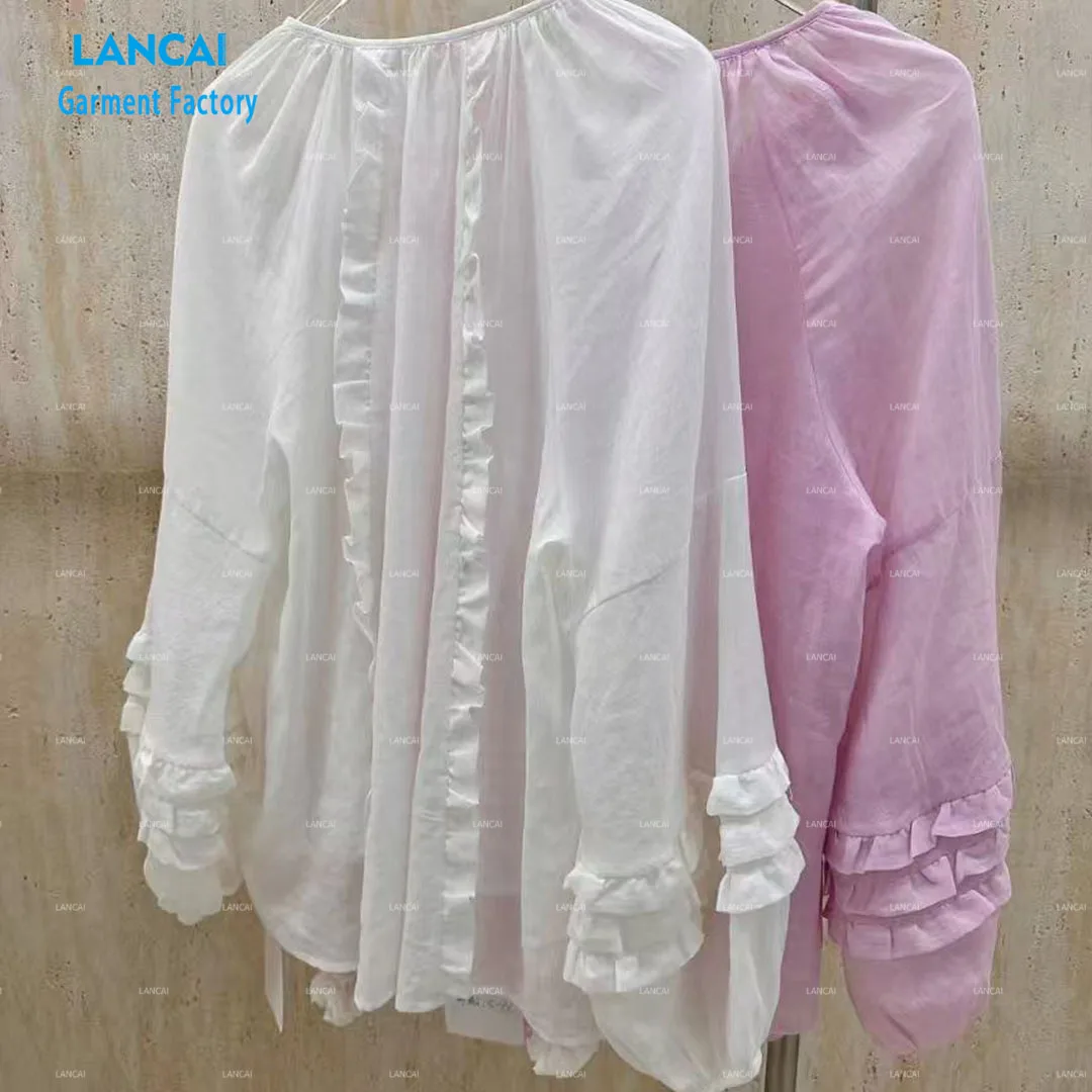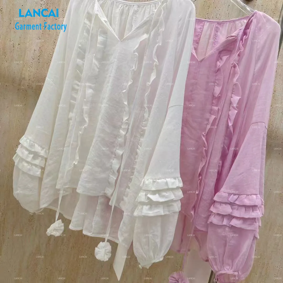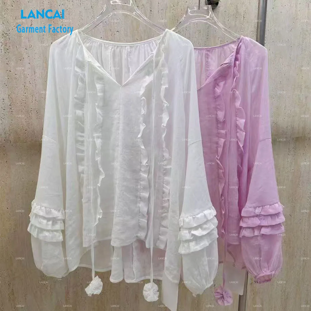 OEM Customized Women's Pull Over Tops Light Weight Sheer Solid Color V-neck Ruffled Details Long Sleeve Blouse Causal Shirts