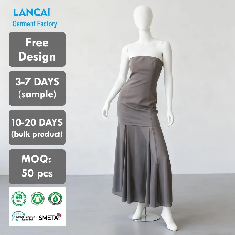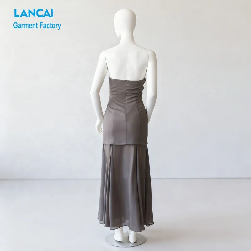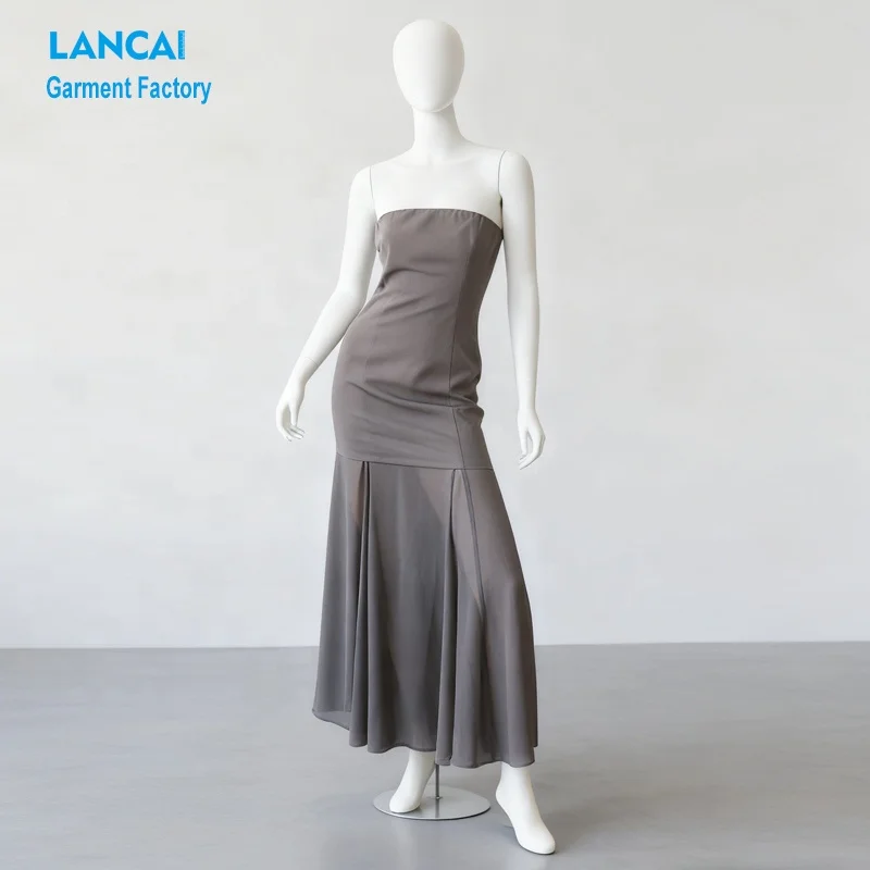 OEM Women Clothes Manufacturer Custom Strapless Semi-Sheer Mesh Panel Textured Draped Maxi Dress