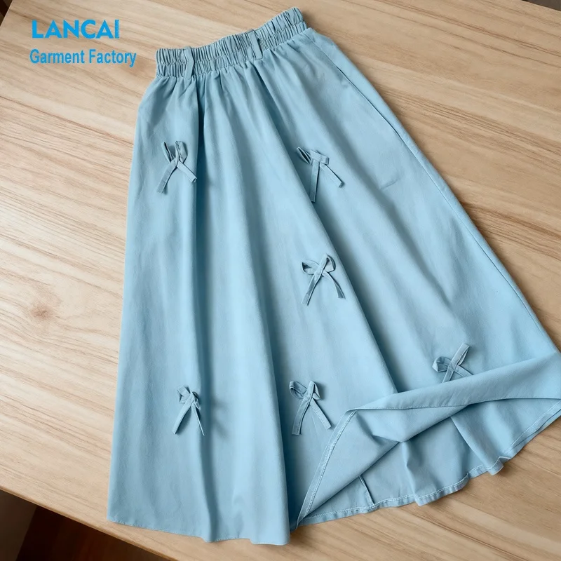Women's Light Blue Midi Skirt Customizable Elastic Waist Cotton Linen A-Line Midi Skirts with Bow Decor