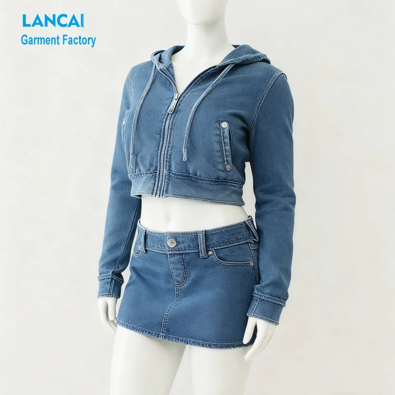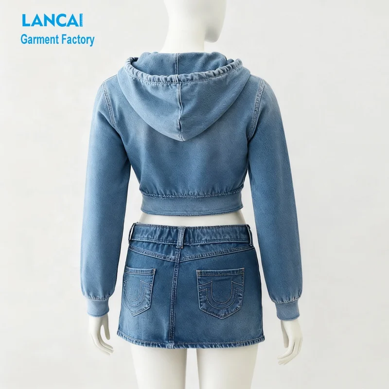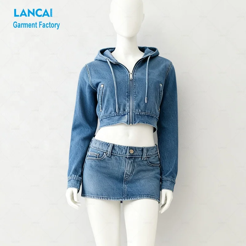 Women's Denim Two-Piece Set Customizable Cropped Hooded Jacket and Mini Skirt Casual Streetwear Denim Co-ord Set