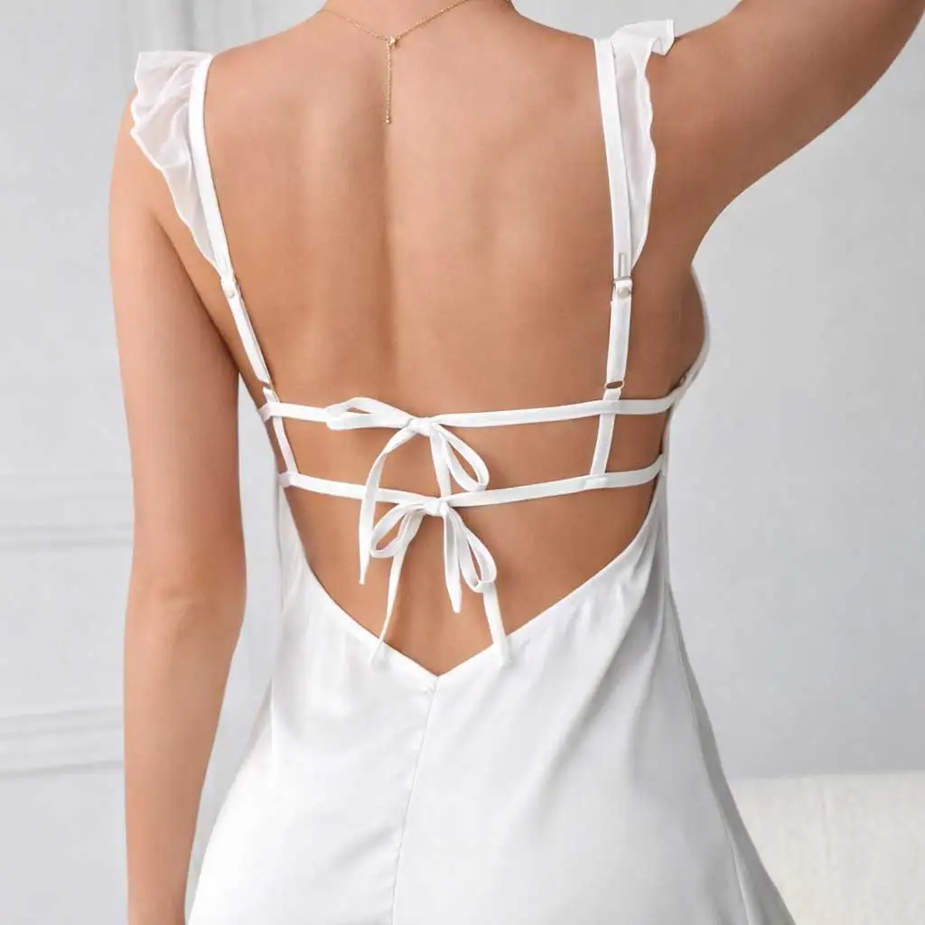 Women Elegant Sexy Spaghetti Strap Satin Nightgown Lace Trim Lingerie Style Sleepwear with Front Logo