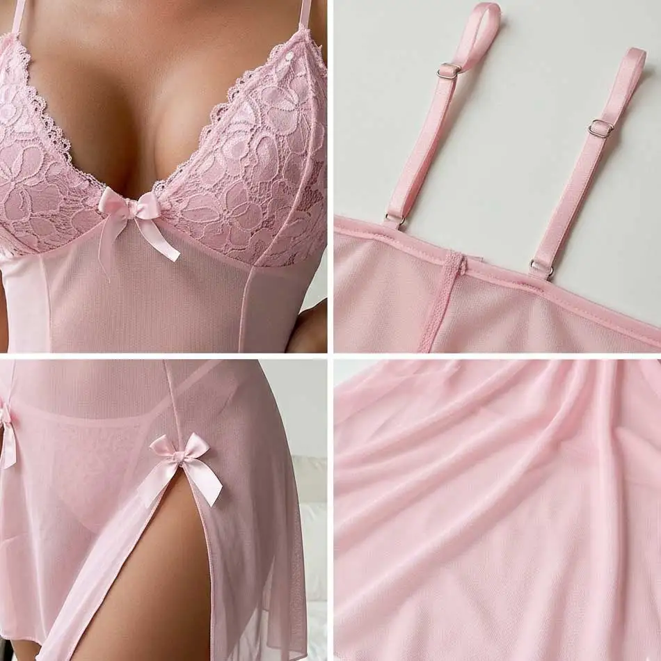 Custom Women Sexy Floral Lace Satin Nightwear Breathable Soft Smooth Nylon Fashion Elegant OEM ODM Factory Direct Front Vacation
