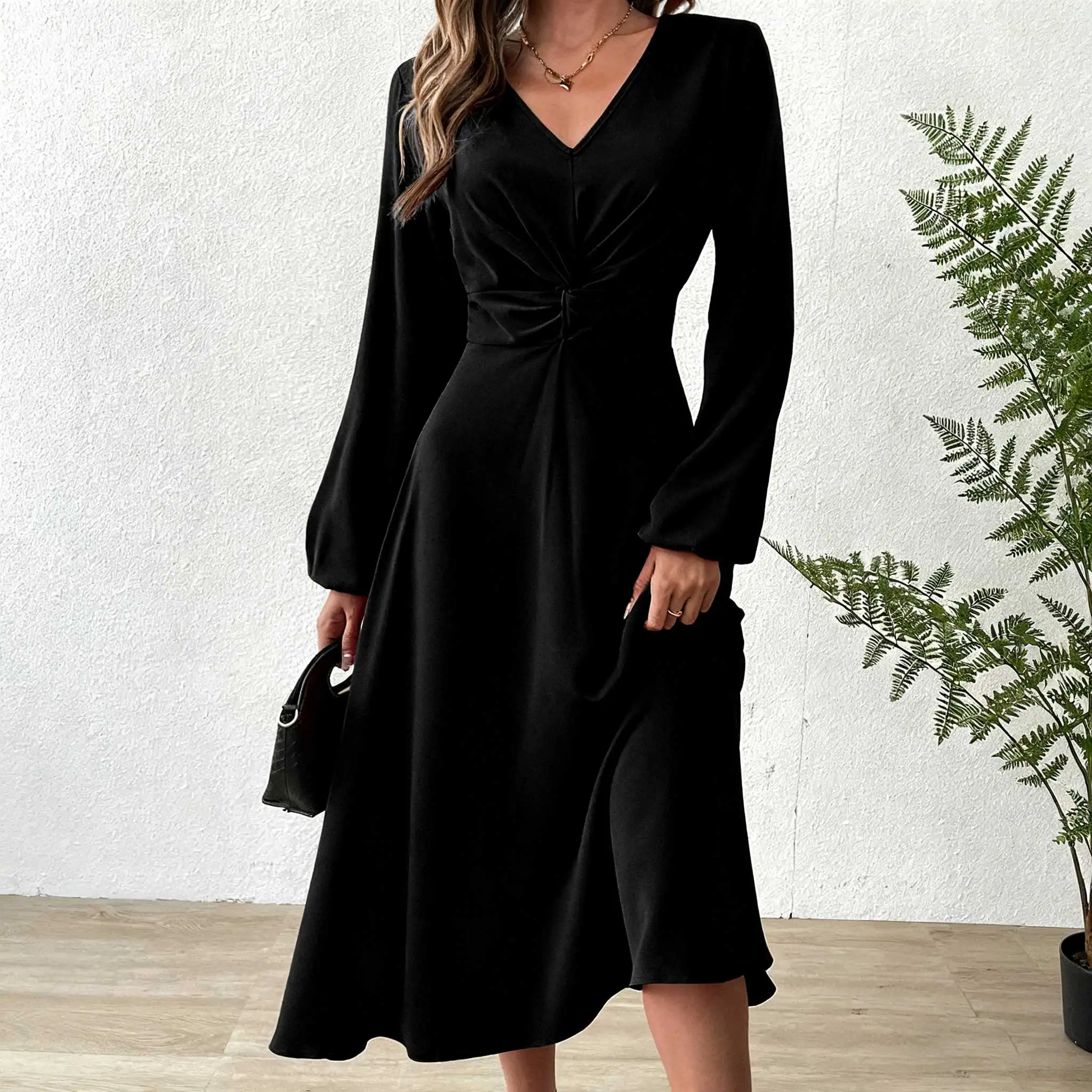 ZYHT 21541 Wholesale Crew Neck High Waist Casual Dresses Elegant Lace Velvet Mermaid Hem Ruched Long Sleeve Dresses for Women