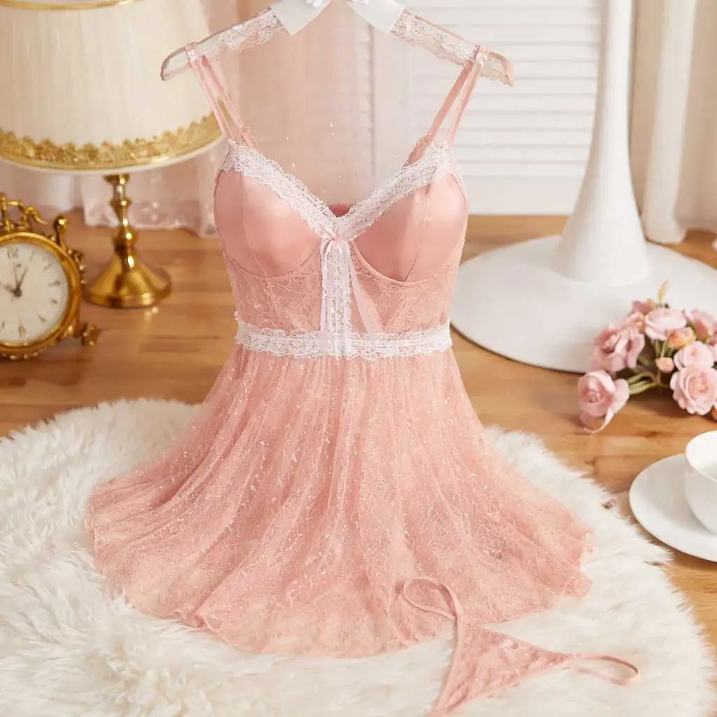 Women Sexy Cami Style Floral Satin Breathable Soft Elegant V-neck Front ODM Nylon Lace Nightdress Sleepwear