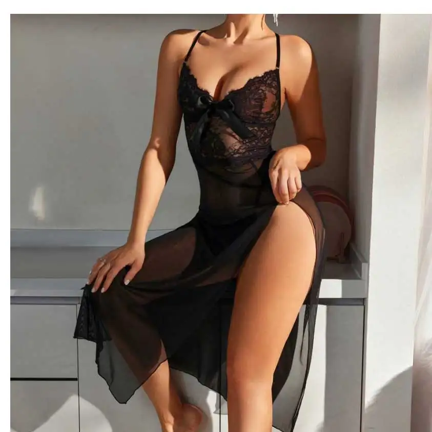 Luxurious Spaghetti Strap Sexy Women Summer ODM Satin Lace Sleep Dress Soft Breathable High-End Floral Trim Fashion Nightwear