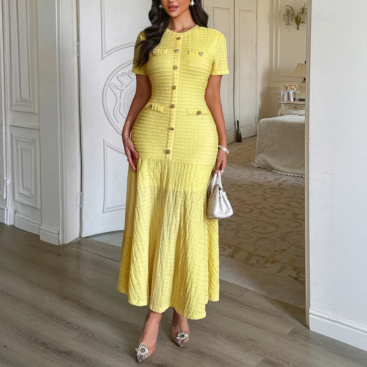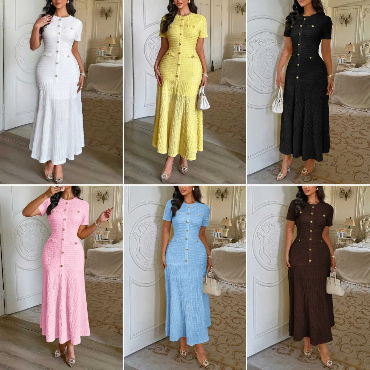 Ladies Bodycon Maxi Dress Women's Elegant Fashion Button Round Neck Short Sleeve Ribbed Knit Casual Dresses