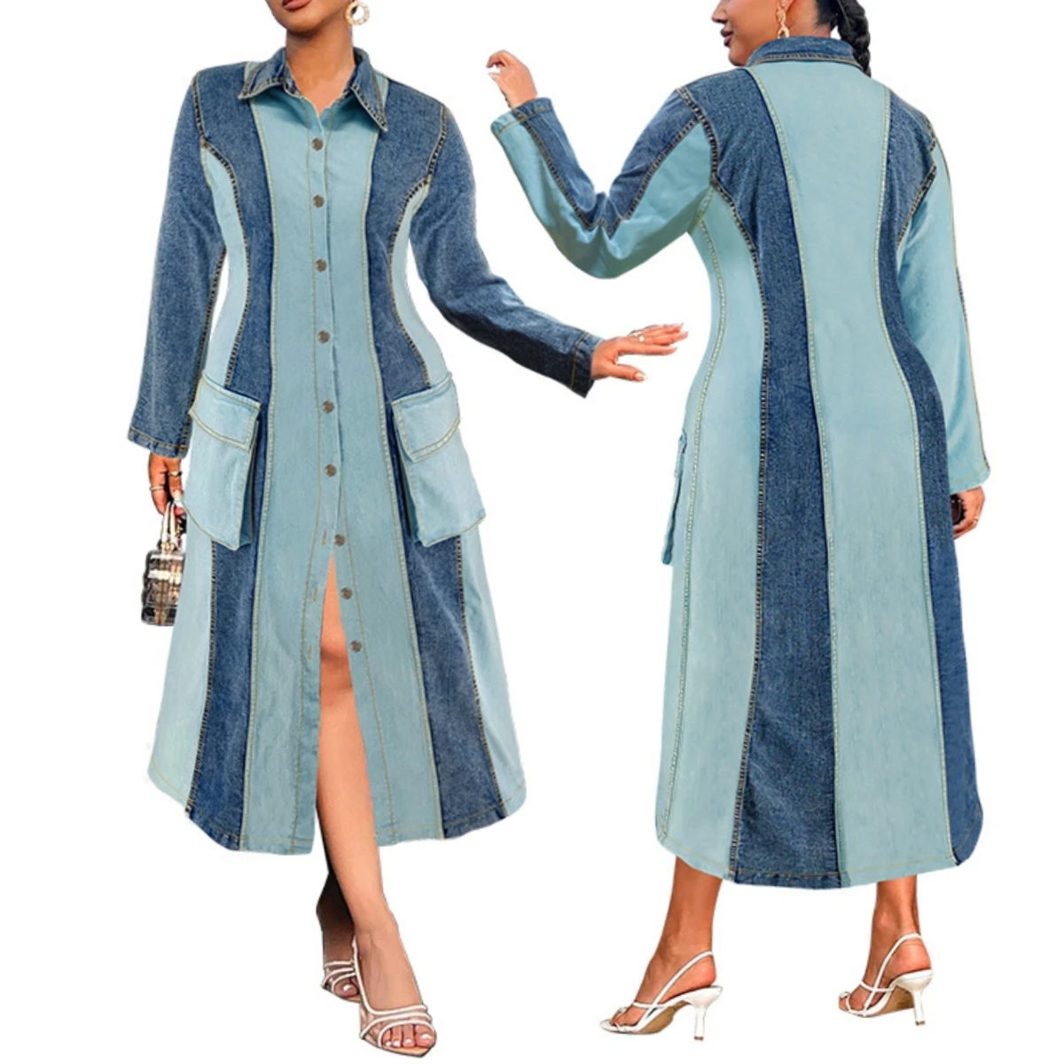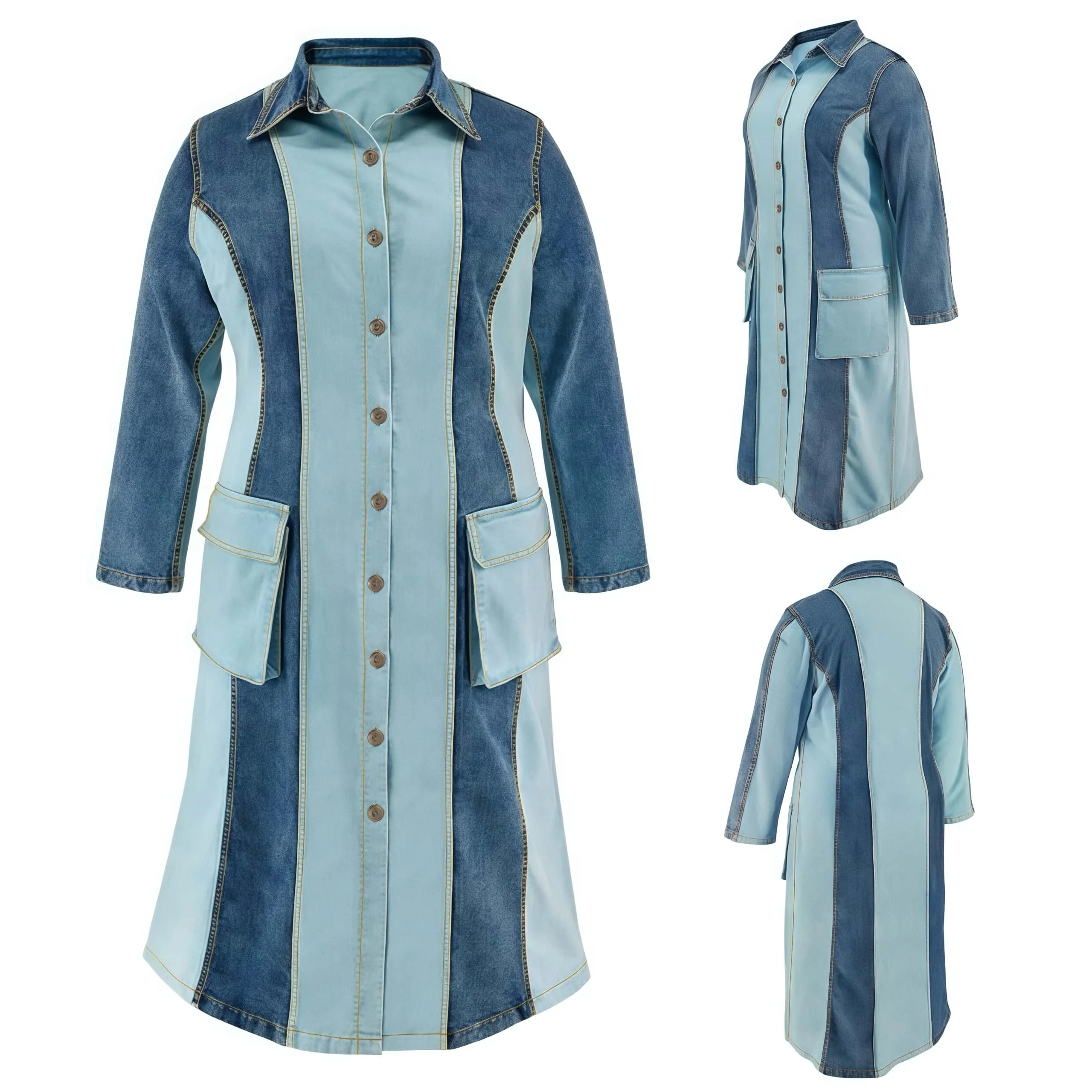218539 Fashion Ladies Plus Size Jeans Dress Women Contrast Color Single Breasted Lapel Long Sleeve Denim Dresses for Women