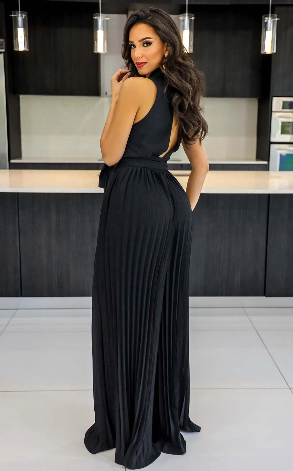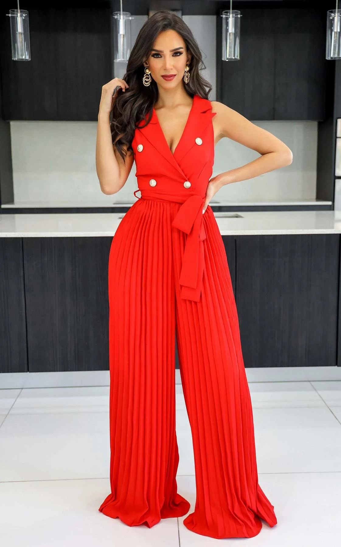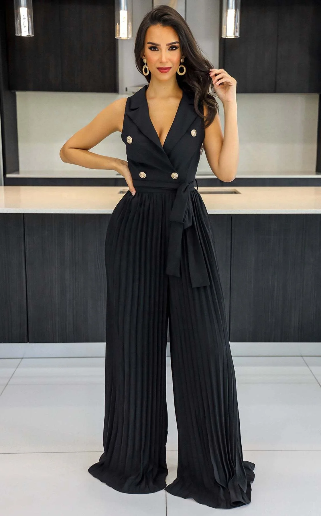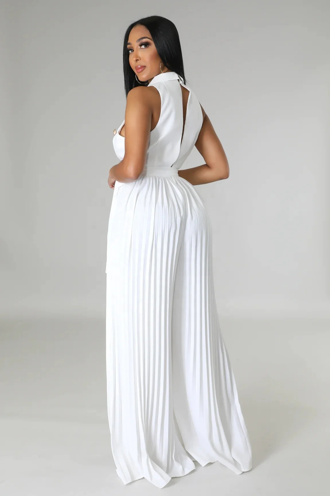 10037 Spring Summer 2024 V-Neck Sleeveless Backless Style Street Pleated Wide Leg Jumpsuit Lady Sexy Office One Piece Romper
