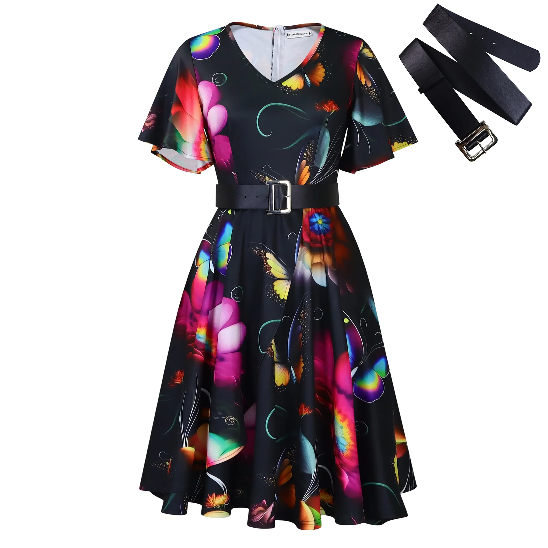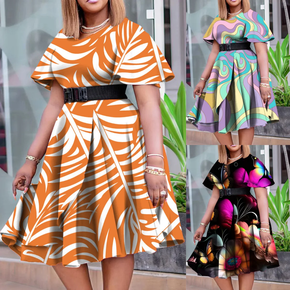Mg8573 Trendy Summer Ladies Office Dresses Women Lady Elegant Short Sleeve Mid Length Printed African Dresses for Women Clothing