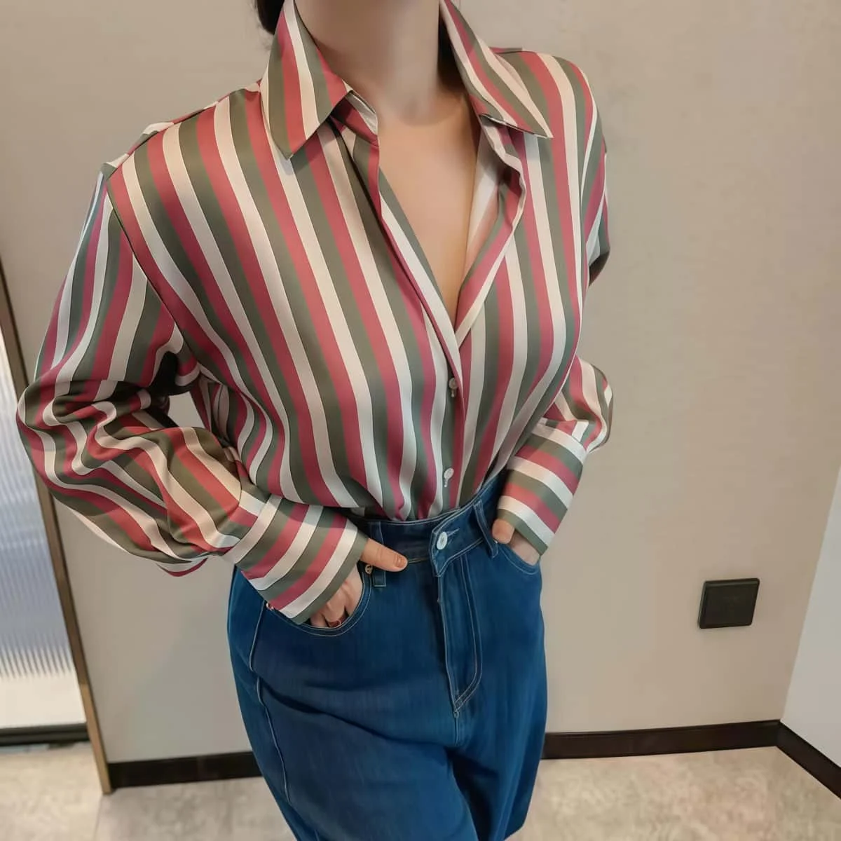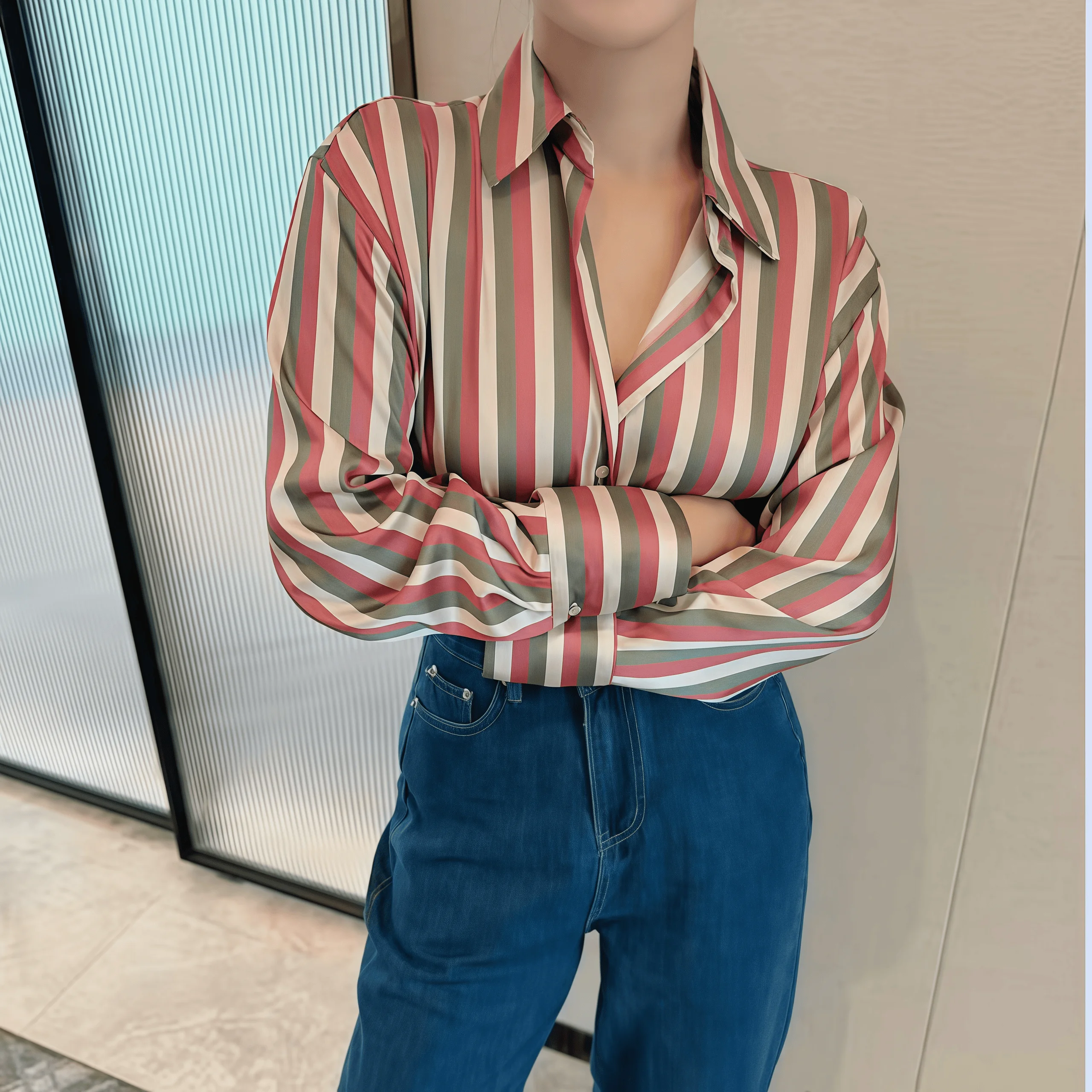 853 Fashion Women Shirt Women Boutique Lapel Satin Long Sleeve Stripped Elegant Tops Ladies Sexy Blouses & Shirt
