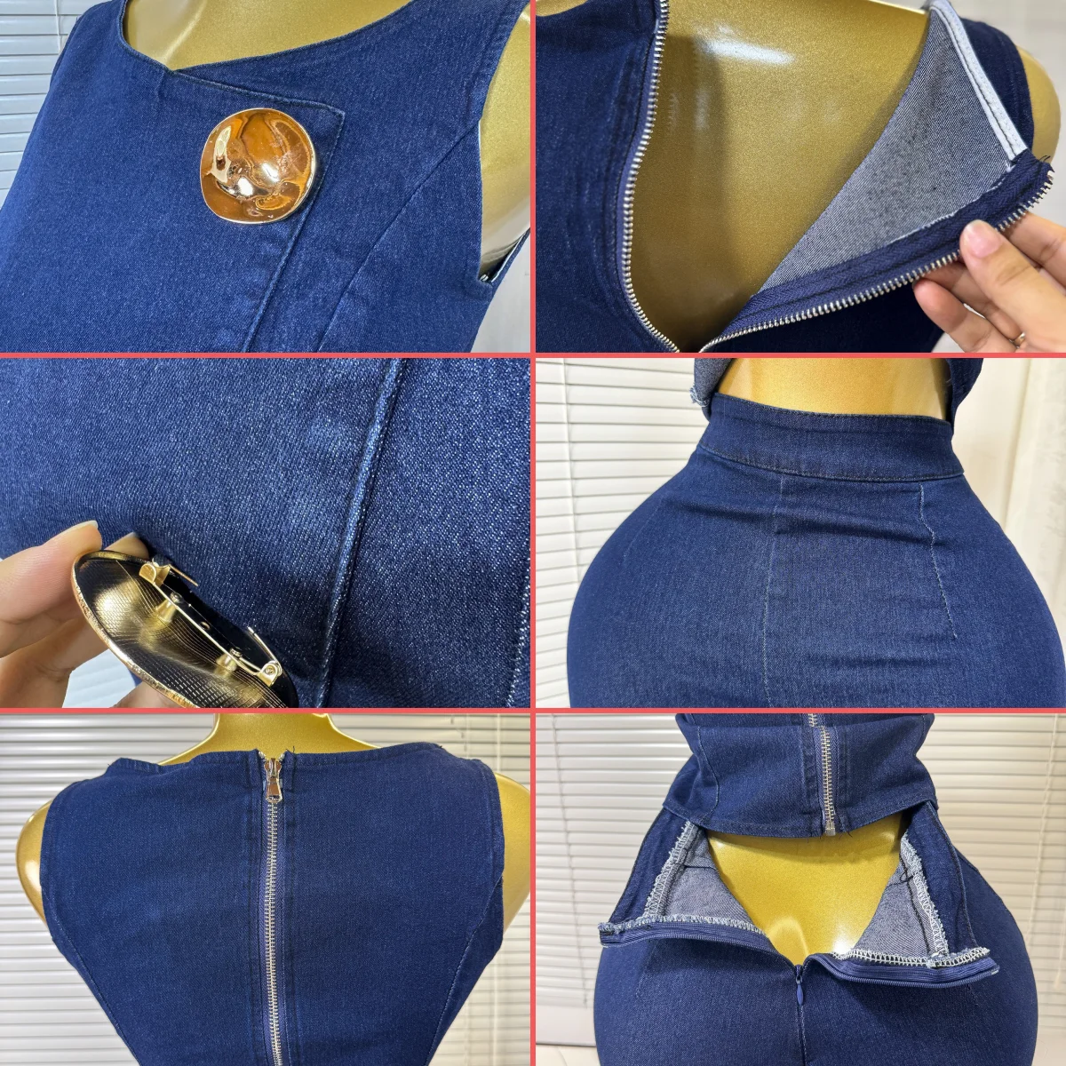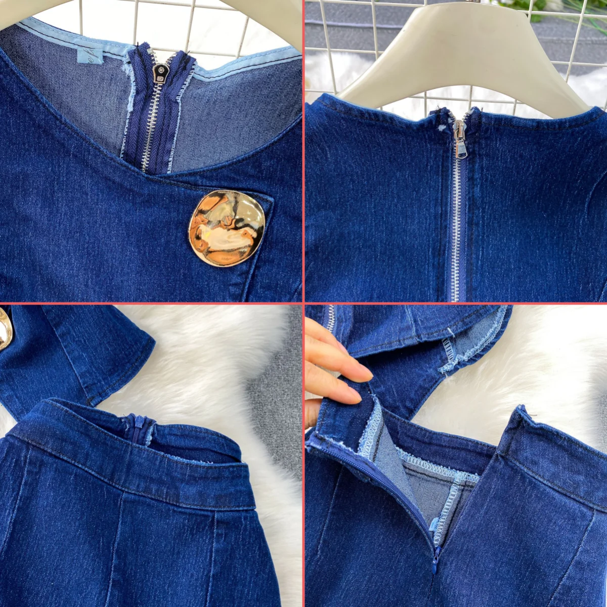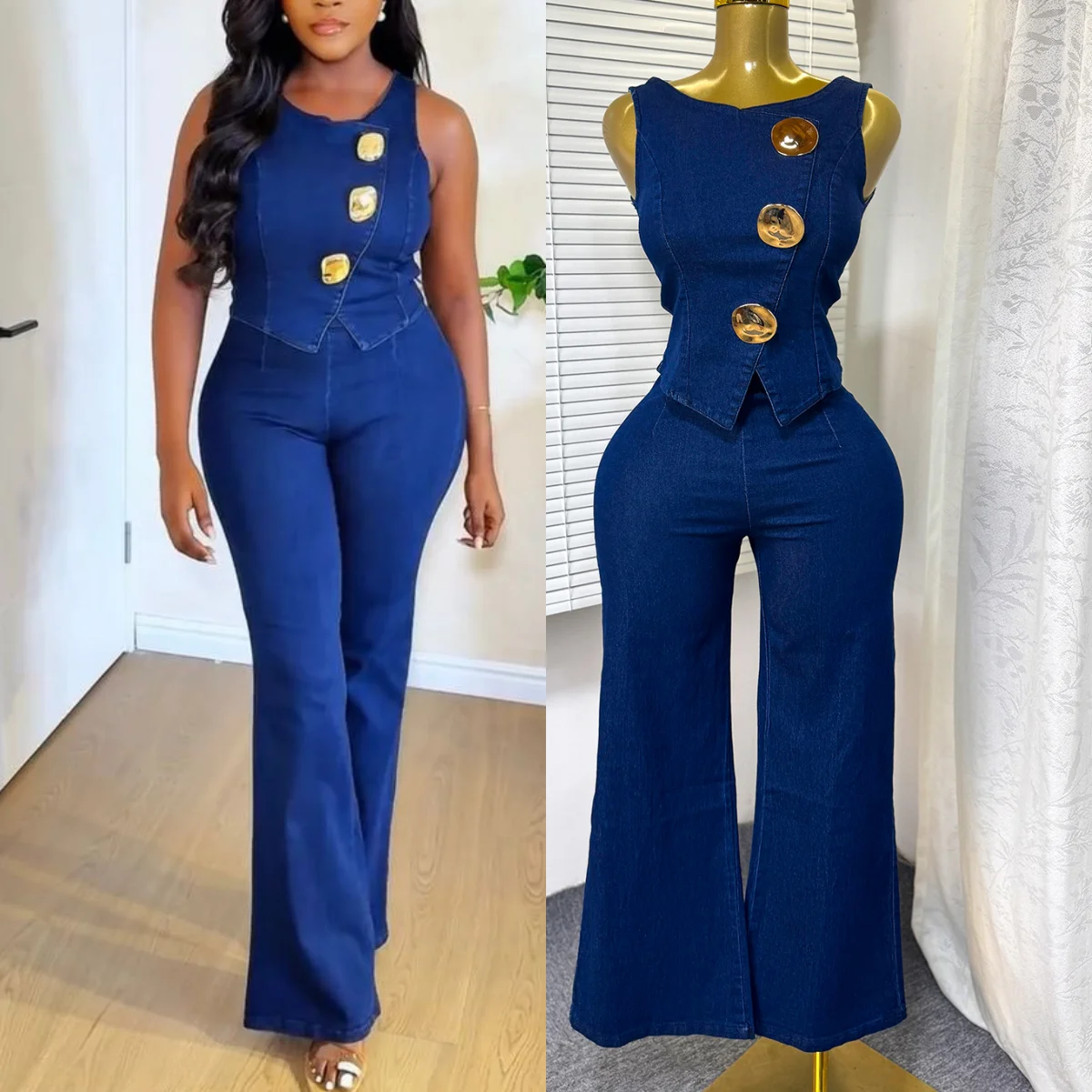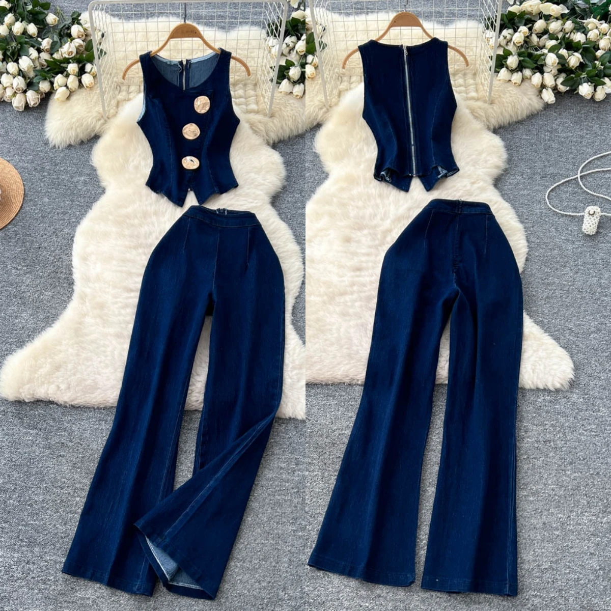 6631 New Arrival Summer Fall Clothing Denim Wear Women Sleeveless Metal Buckle Denim Tops and Wide Leg Jeans Pant 2 Piece Set