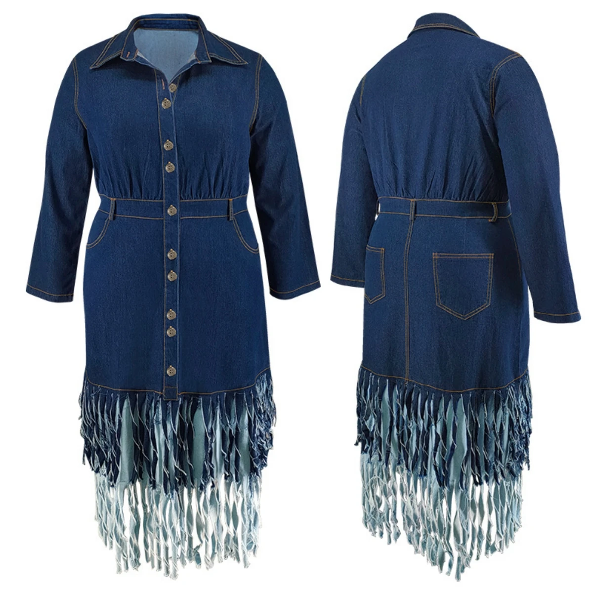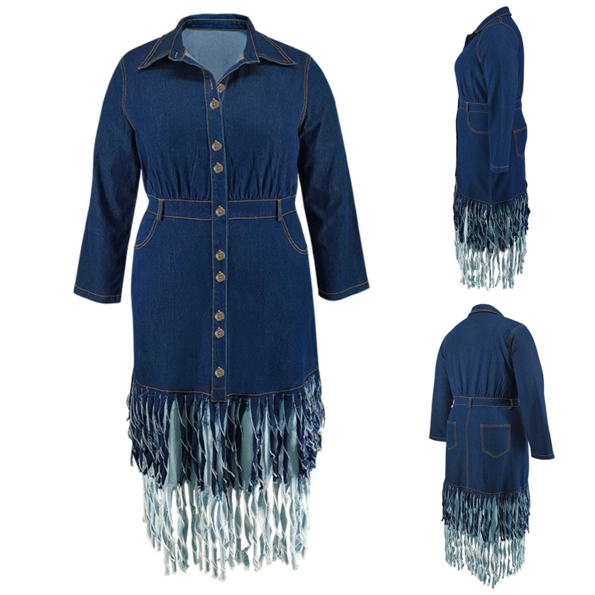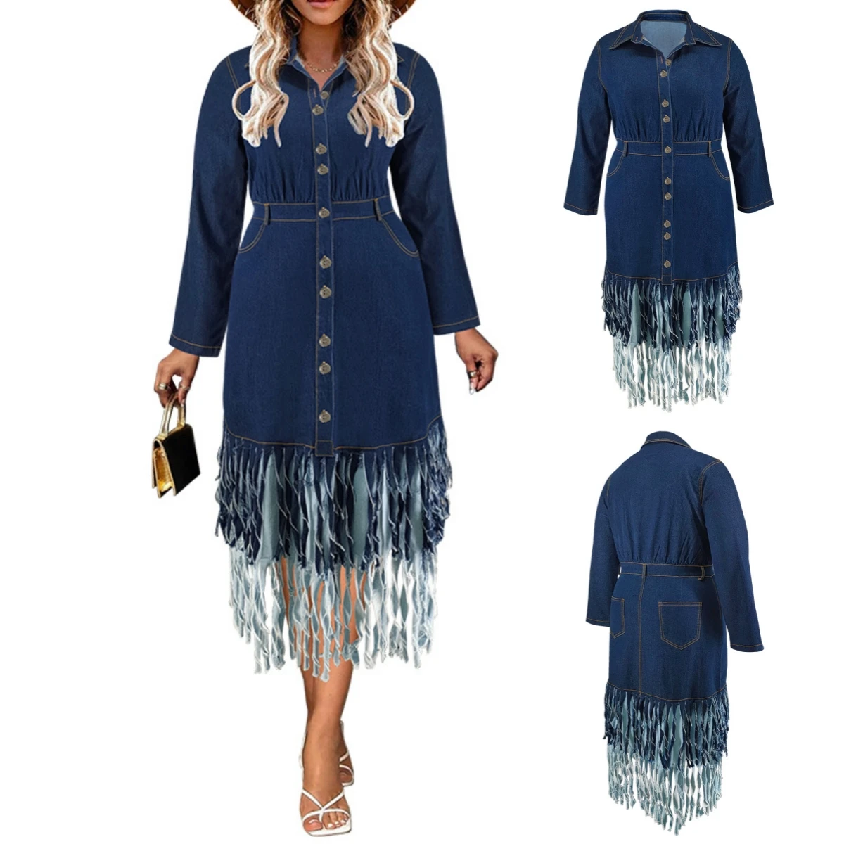 Y218538 New Arrival Plus Size Jeans Dresses Women Casual Long Sleeve Lapel Patchwork Midi Tassel Denim Dresses for Women Ladies