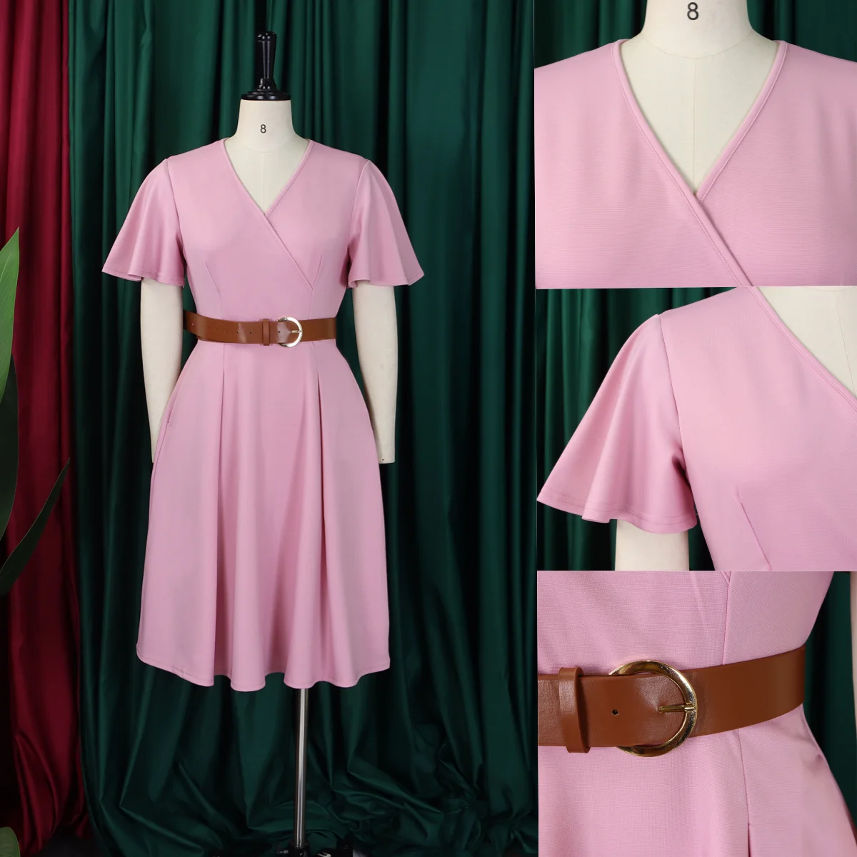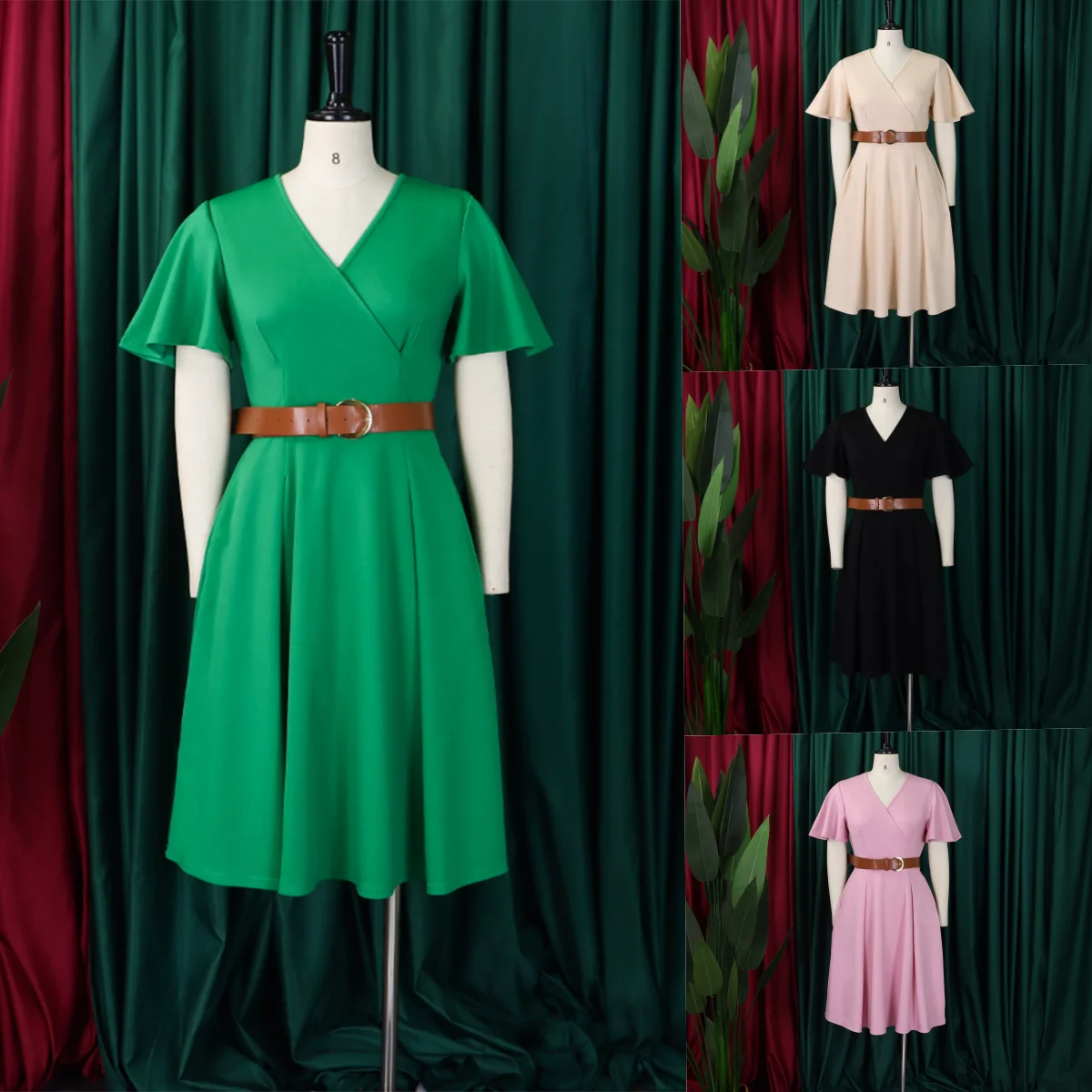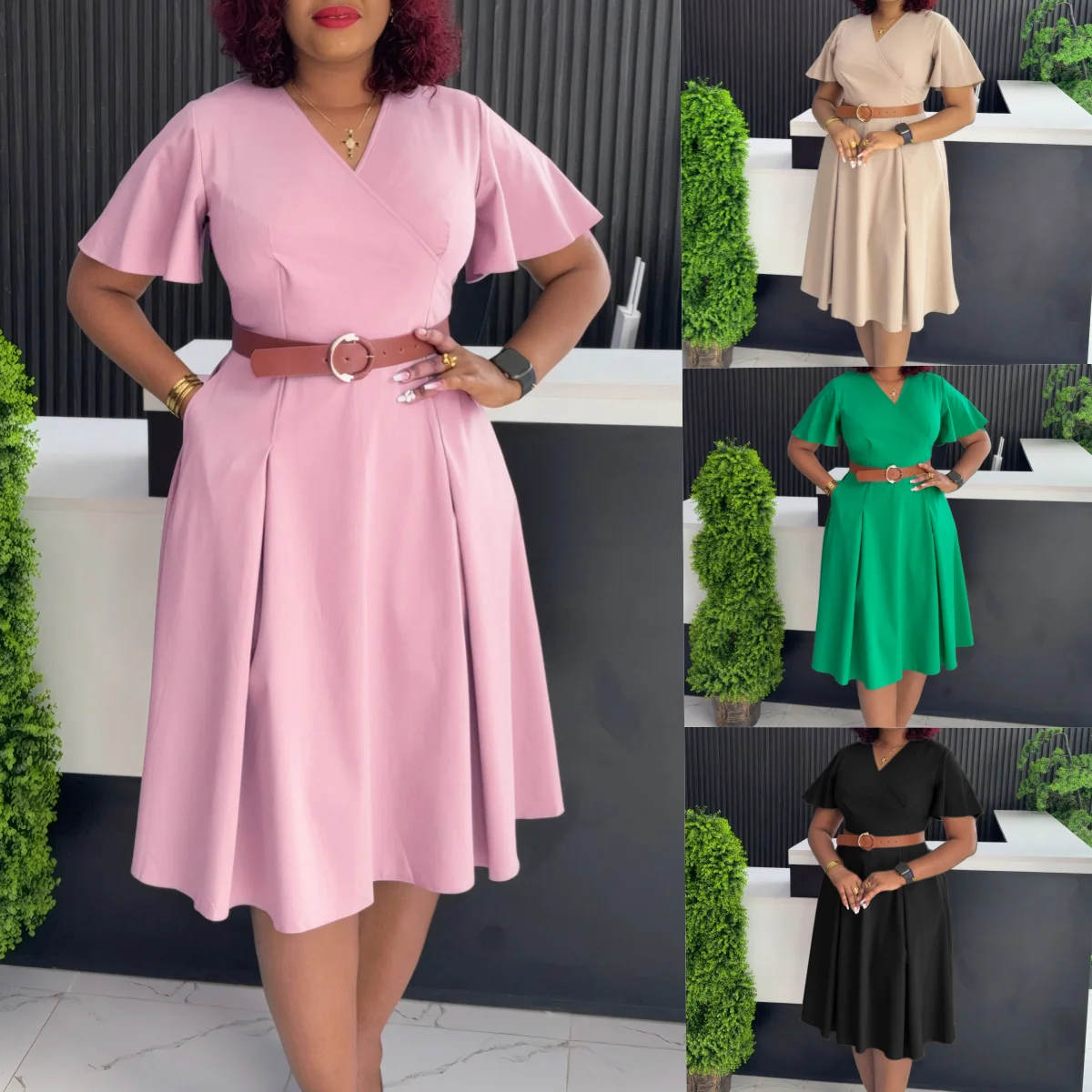 D3333 Women's Short Sleeve Career Dresses Midi Dresses Elegant African Style Casual V-neck with Flare Sleeves for Office Lady