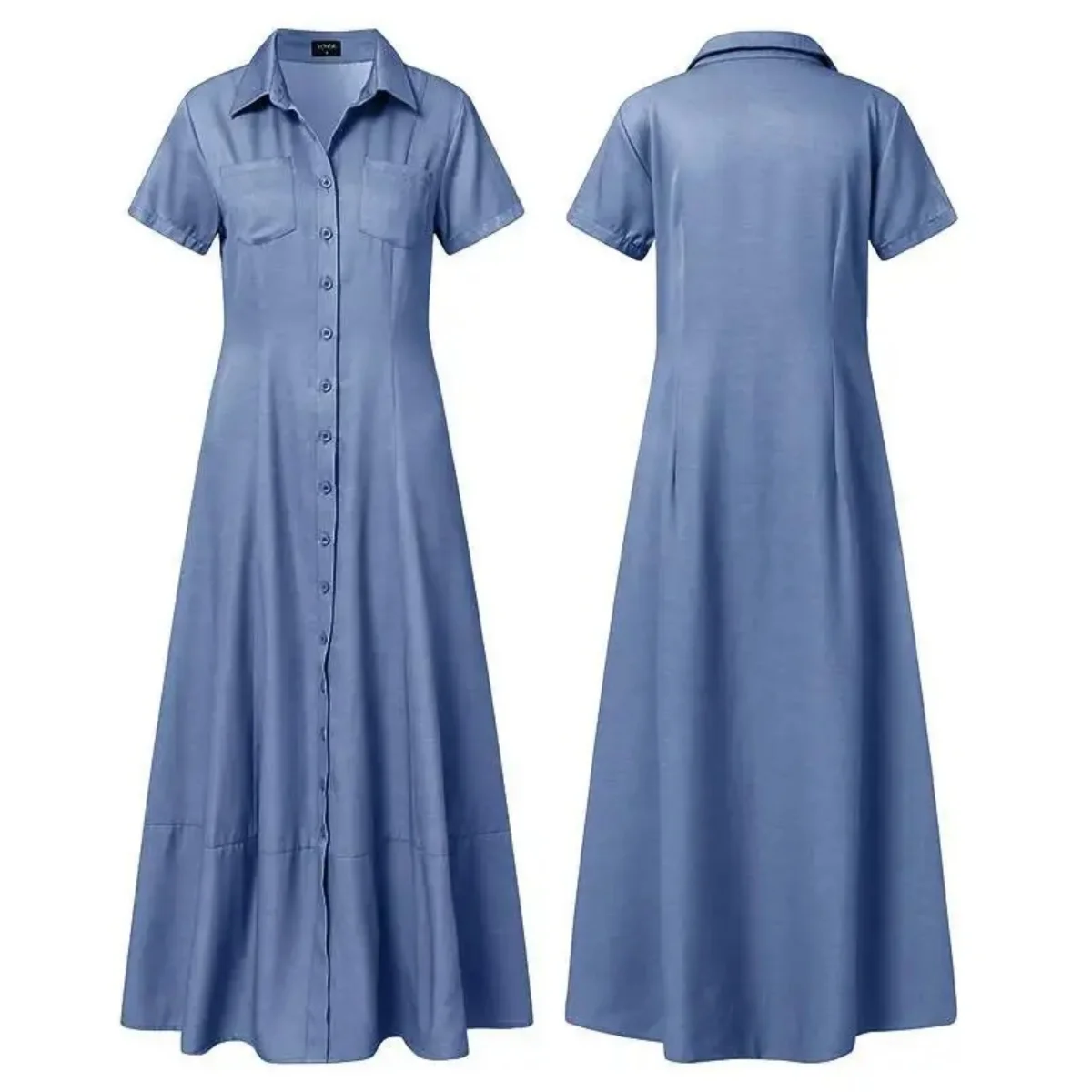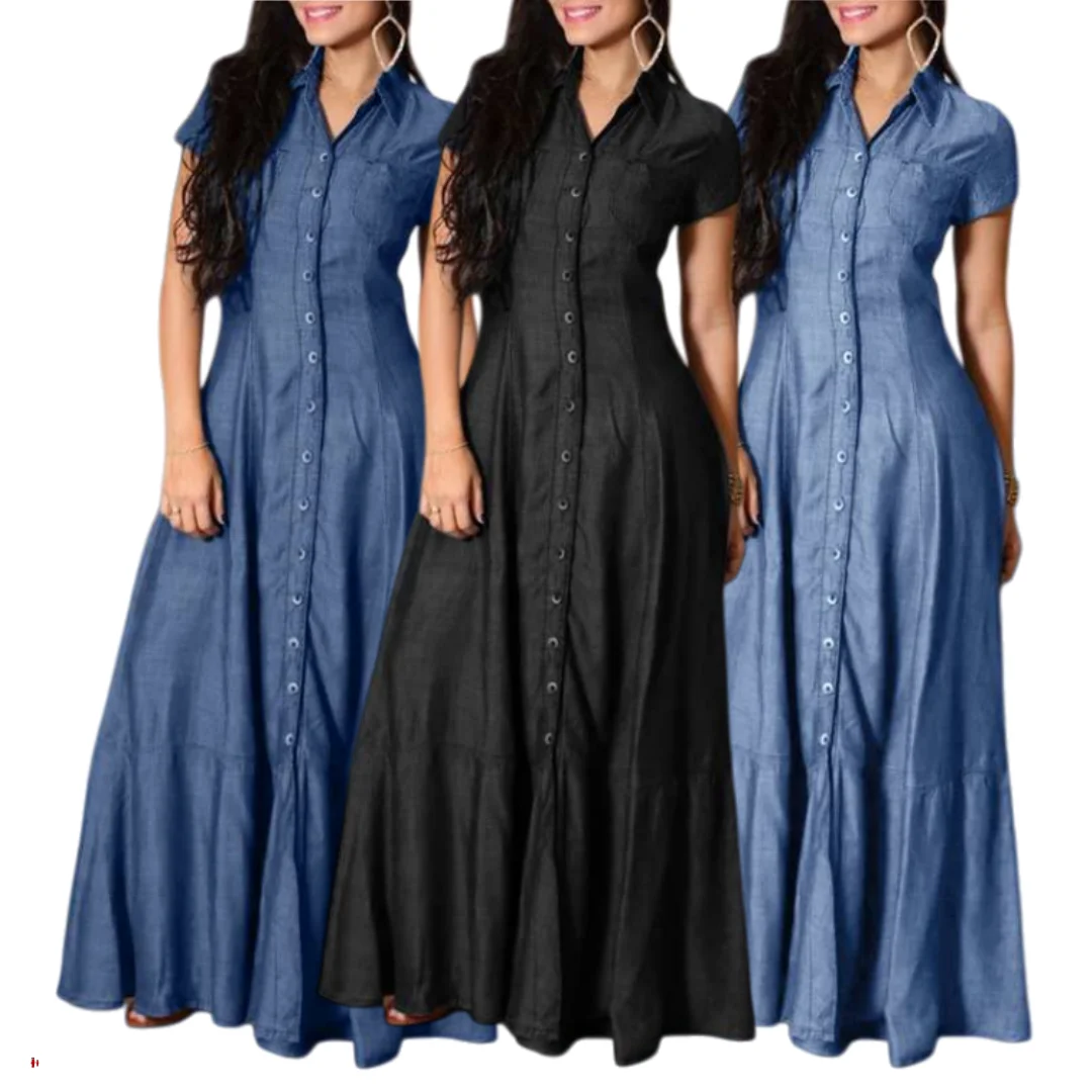 Y7026 Latest Design Plus Size Denim Dresses Shirt Collar A-line Short Sleeve Long Dresses Women Casual Jeans Dress With Pocket