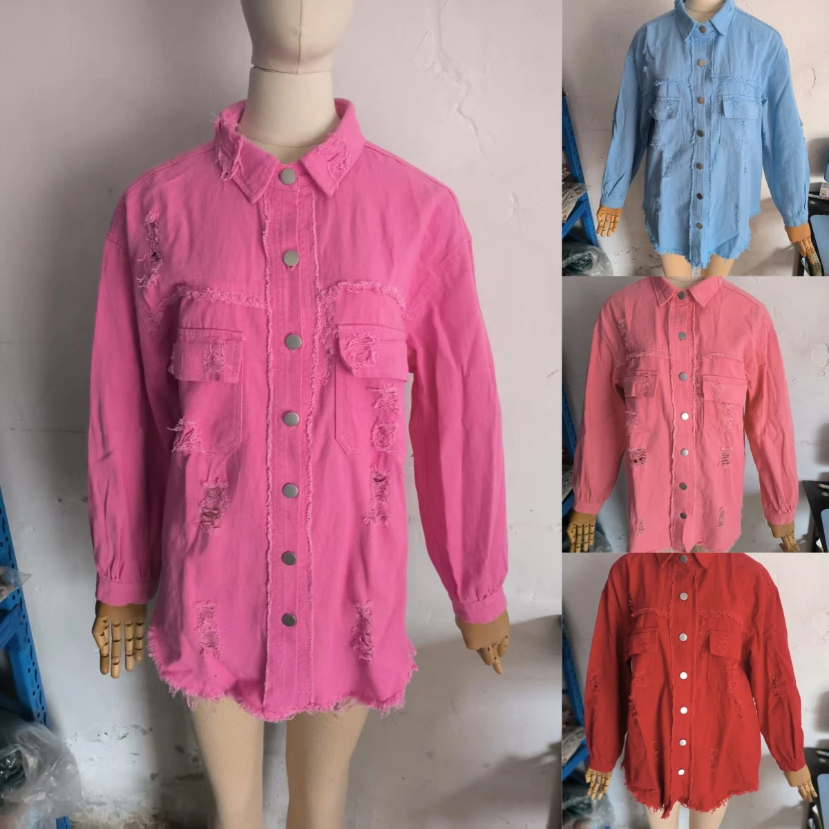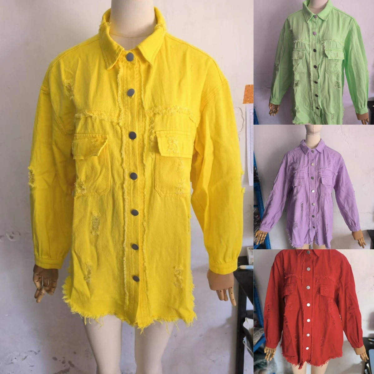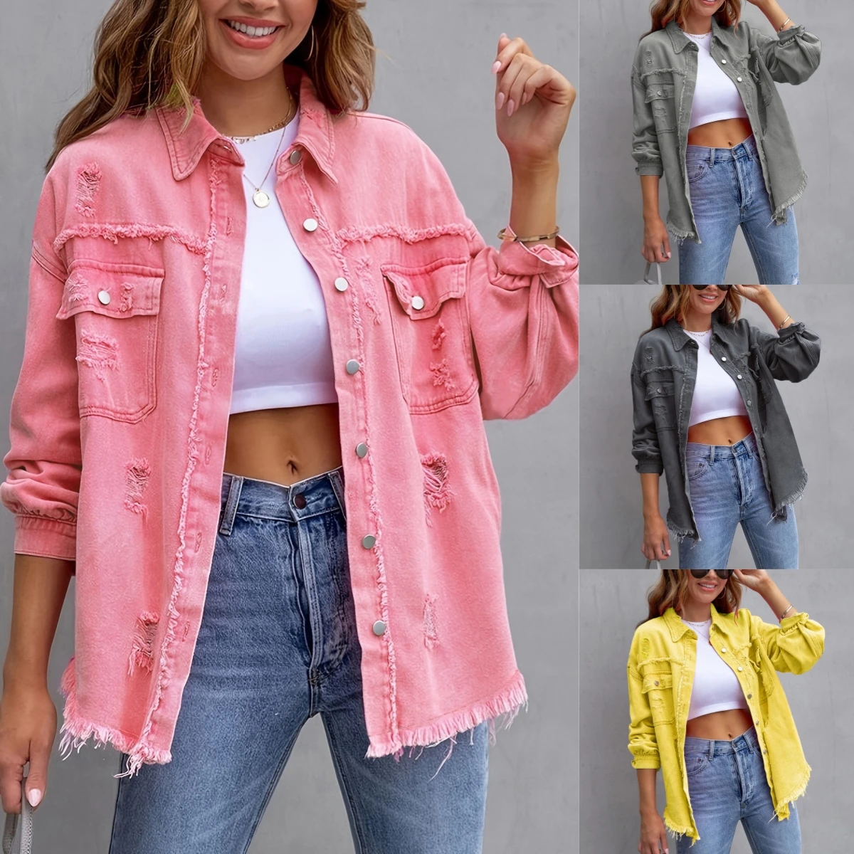 Latest Design S-2xl Mid Length Denim Jacket With Torn Edges and Holes Women's Autumn and Winter Long Sleeved Casual Lapel Top