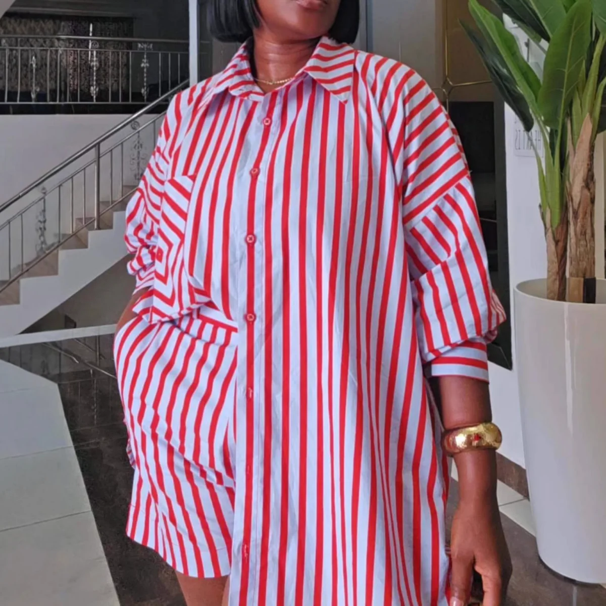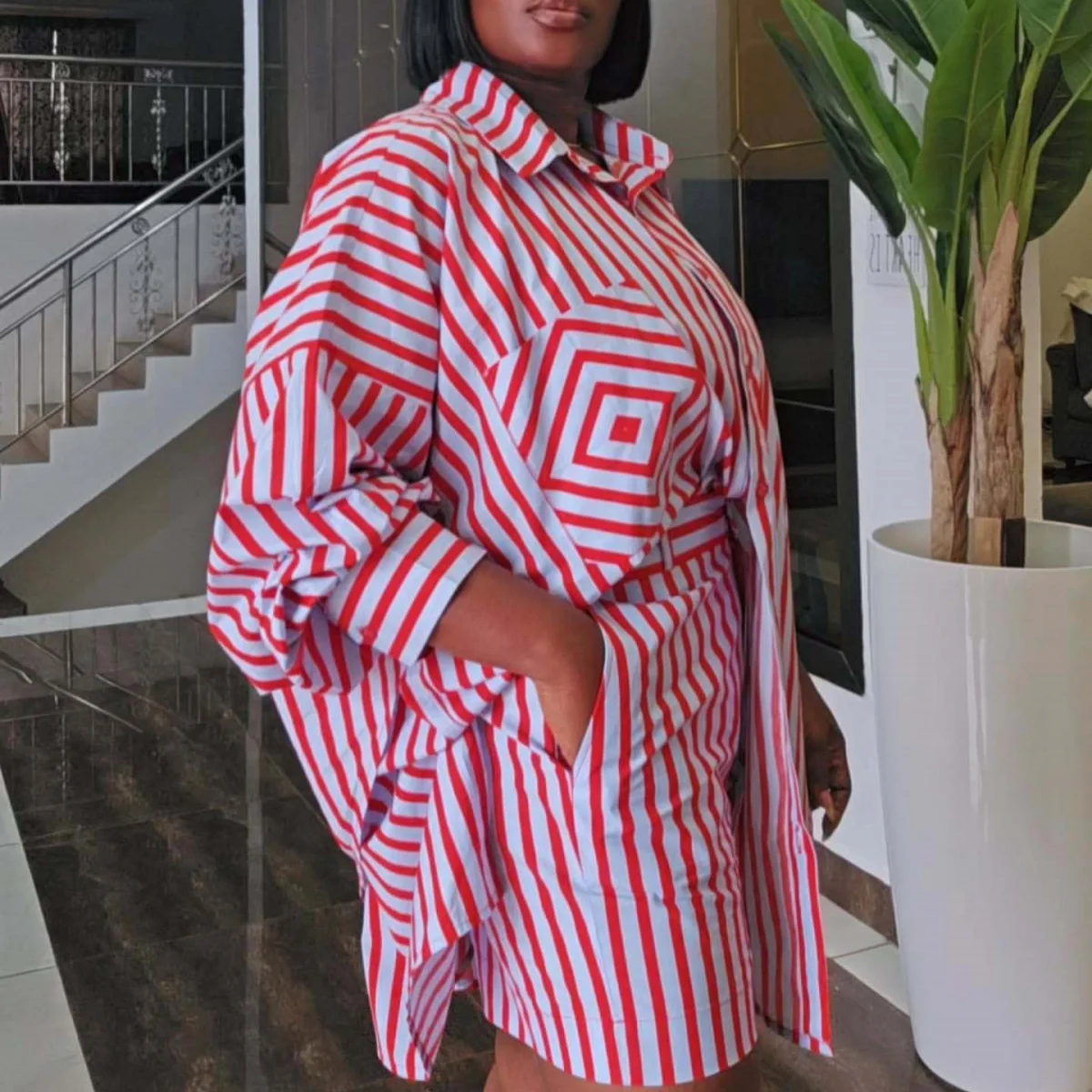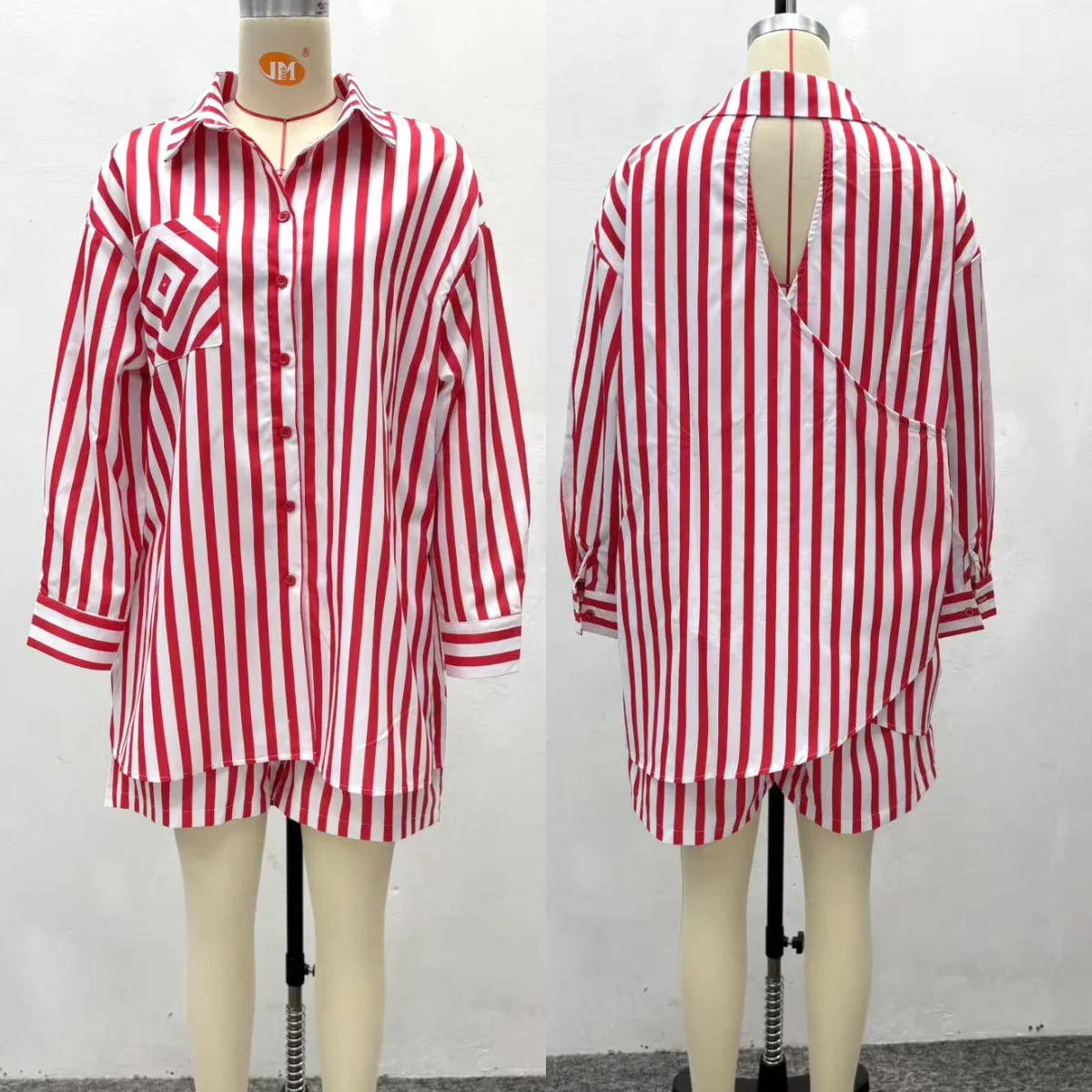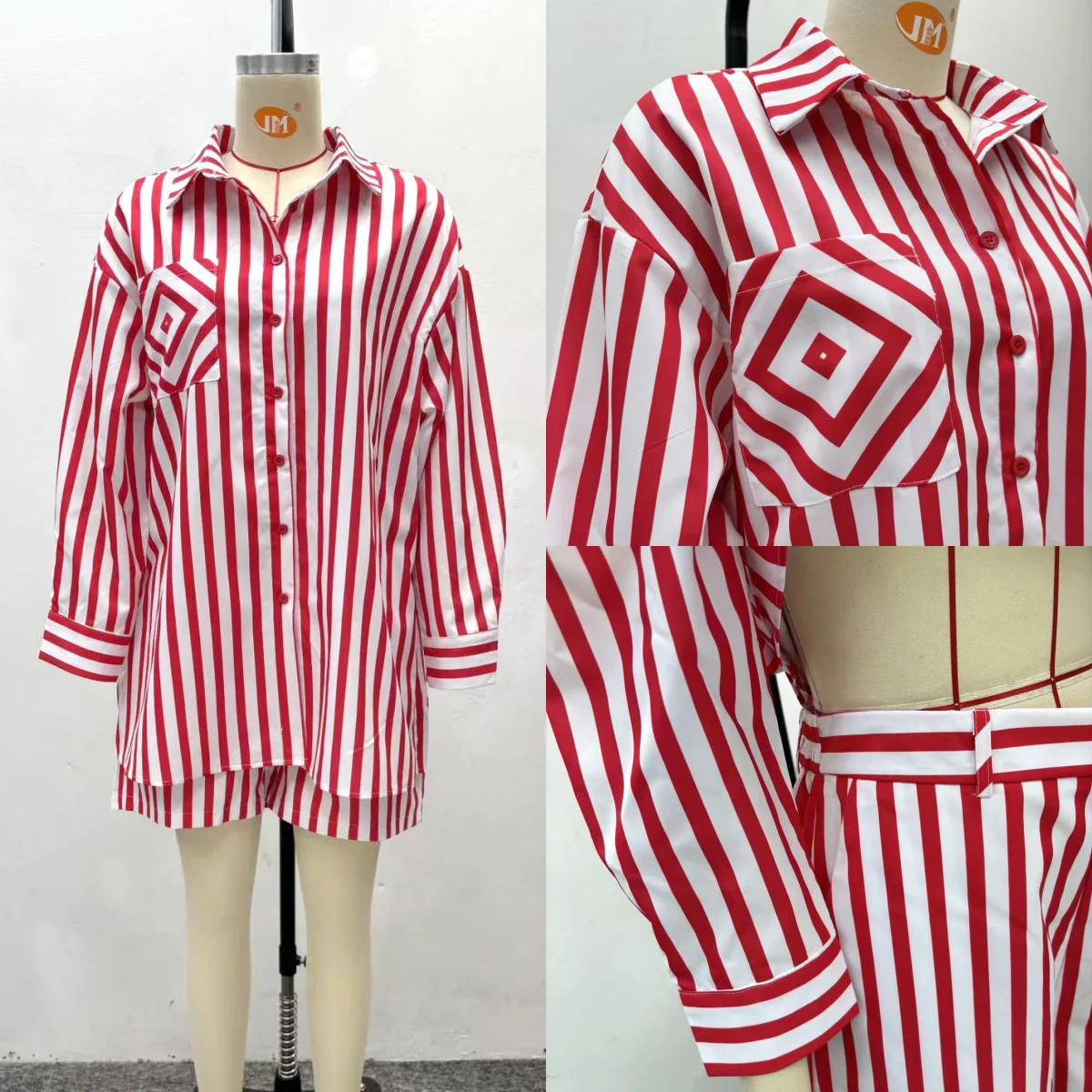 SH7337 Elegant Ladies Casual Two Piece Set Street Wear Long Sleeve Stripped Printed Loose Shirt and Shorts 2 Piece Set for Women