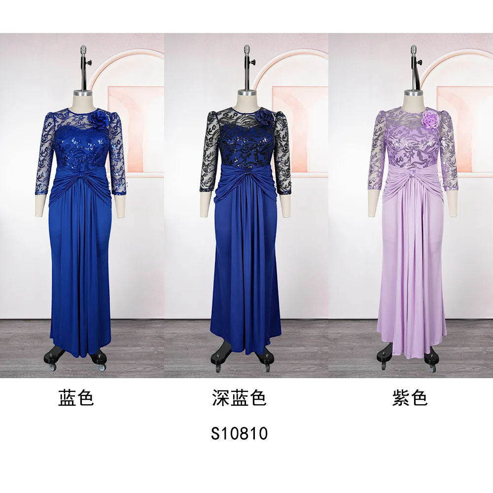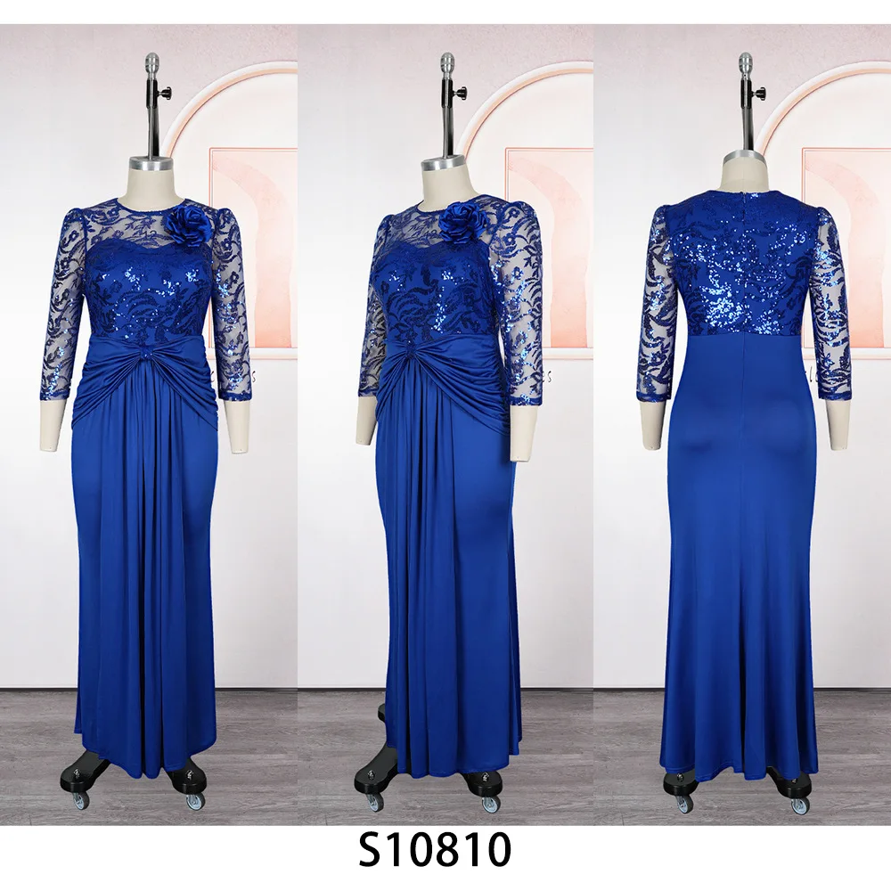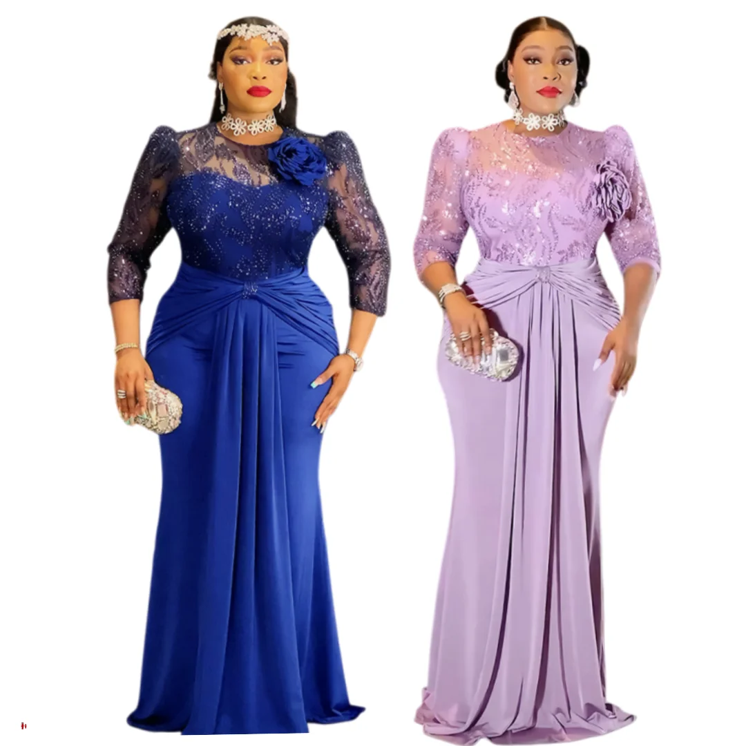 S10810 Plus Size Women Evening Dresses O-neck Sequin Chiffon Church Dress Maxi African Dresses for Women Clothing With Flower