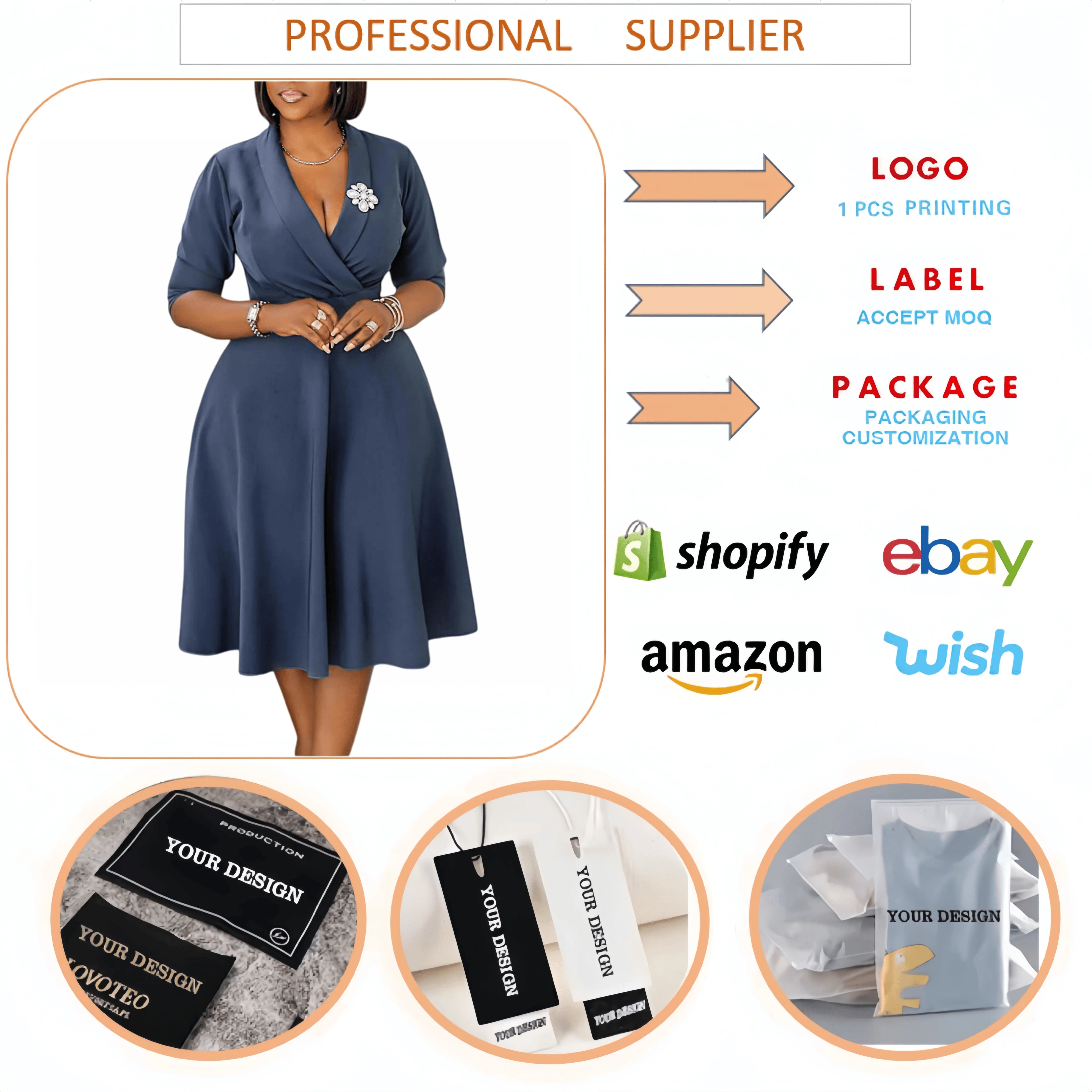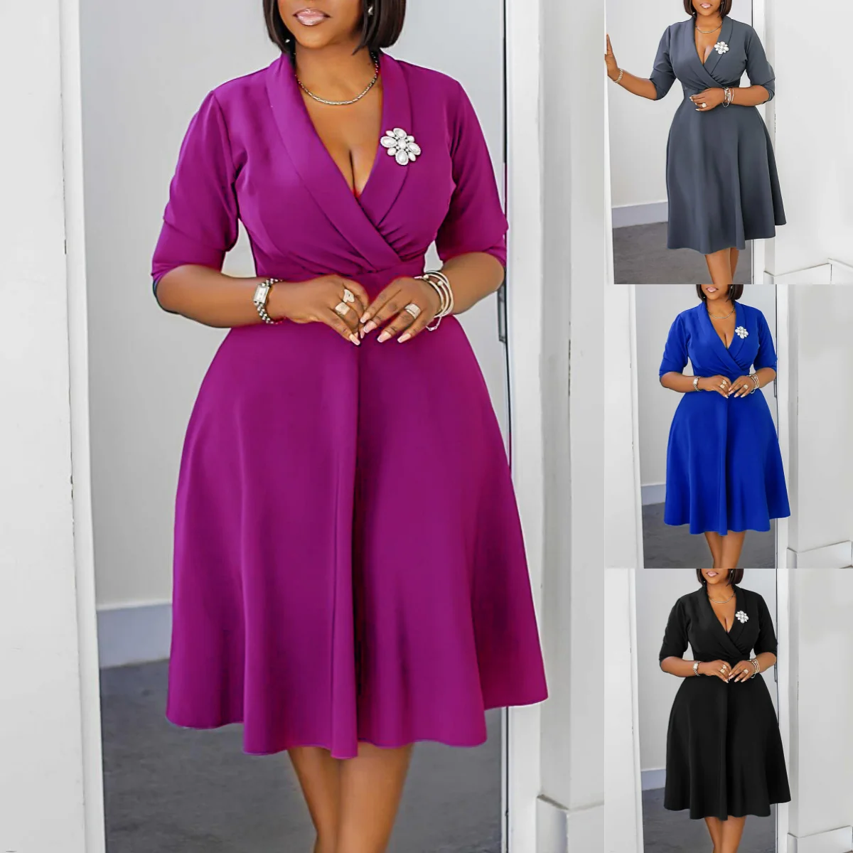 C8650 Fashion Spring&summer Dresses Women Casual Suit Collar V-neck 3/4 Sleeve A-line Office Lady Dress Elegant African Dresses