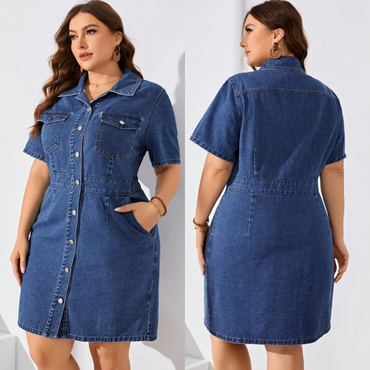 218813 Fashion Ladies Denim Dresses Women Slim Short Sleeve Turn-down Collar Cotton Jean Shirt Dress Women Plus Size Denim Dress