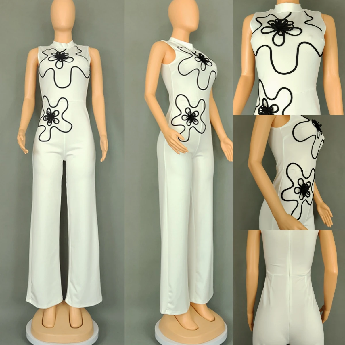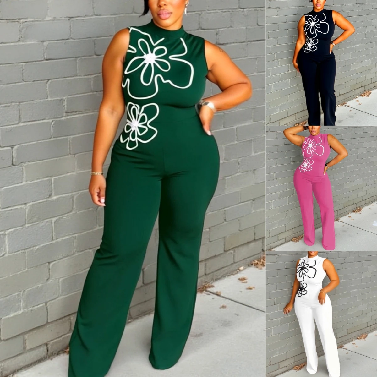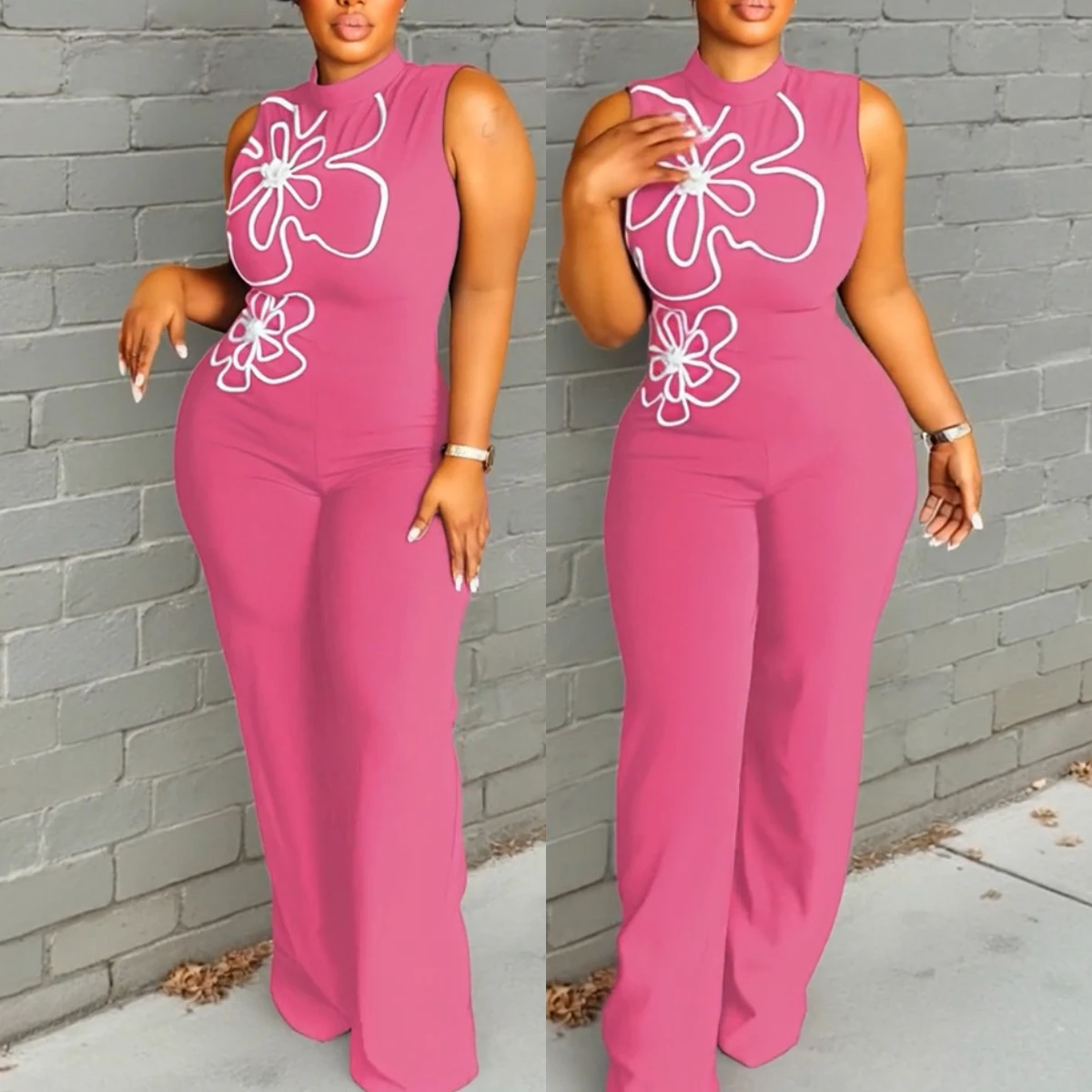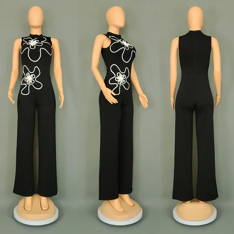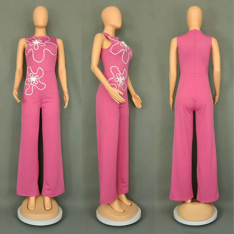 830 Latest Design Fashion Summer Women Clothing Boutique Sleeveless O-neck 3d Floral Style One Piece Ladies Wide Leg Jumpsuit